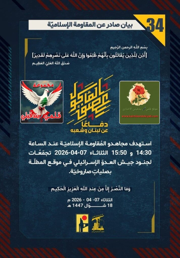 🛑 صدر بيان رقم (34) للمقاومة الإسلامية الآتي نصه:”دفاعًا عن لبنان وشعبه، استهدف مجاهدو المُقاومة الإسلاميّة عند الساعة 14:30 و 15:50 الثلاثاء 07-04-2026 تجمّعًات لجنود جيش العدوّ الإسرائيلي في موقع المطلّة بصلياتٍ صاروخيّة.”