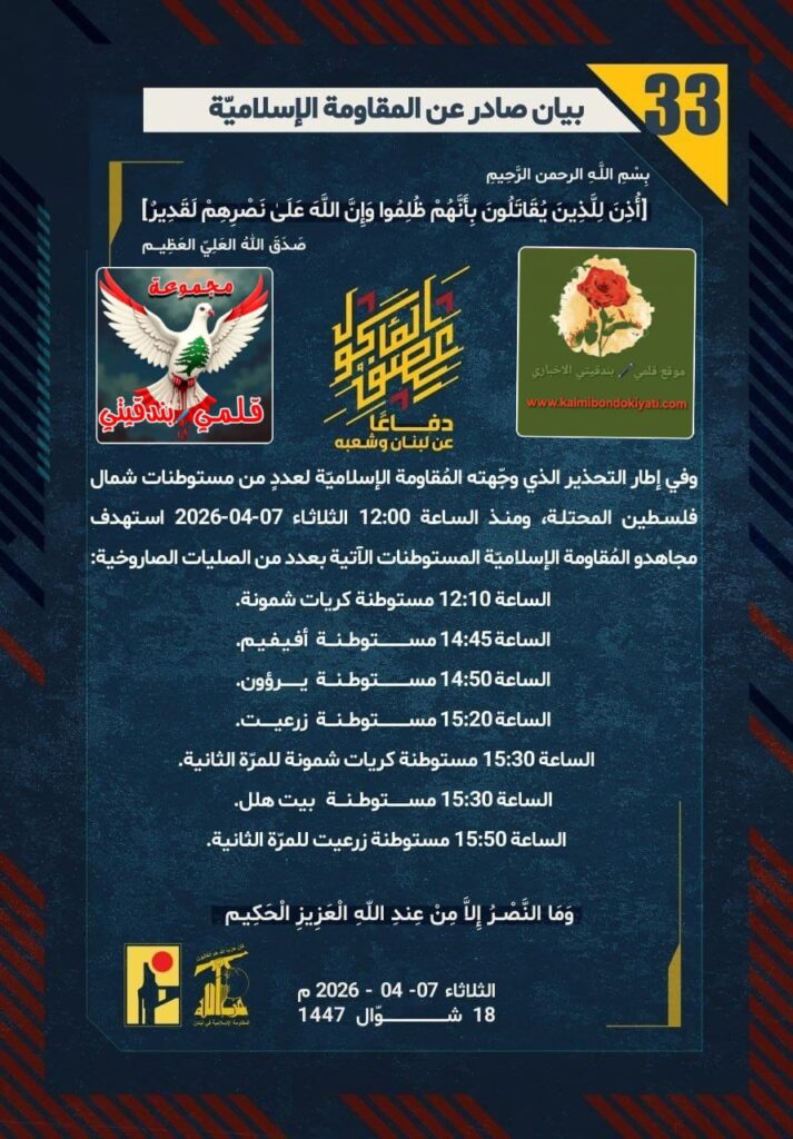 🛑 صدر بيان رقم (33) للمقاومة الإسلامية الآتي نصه:”دفاعًا عن لبنان وشعبه، وفي إطار التحذير الذي وجّهته المُقاومة الإسلاميّة لعددٍ من مستوطنات شمال فلسطين المحتلة، ومنذ الساعة 12:00 الثلاثاء 07-04-2026 استهدف مجاهدو المُقاومة الإسلاميّة المستوطنات الآتية بعدد من الصليات الصاروخية: