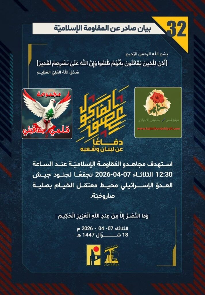 🛑 صدر بيان رقم (32) للمقاومة الإسلامية الآتي نصه:”دفاعًا عن لبنان وشعبه، استهدف مجاهدو المُقاومة الإسلاميّة عند الساعة 12:30 الثلاثاء 07-04-2026 تجمّعًا لجنود جيش العدوّ الإسرائي محيط معتقل الخيام بصلية صاروخيّة.”