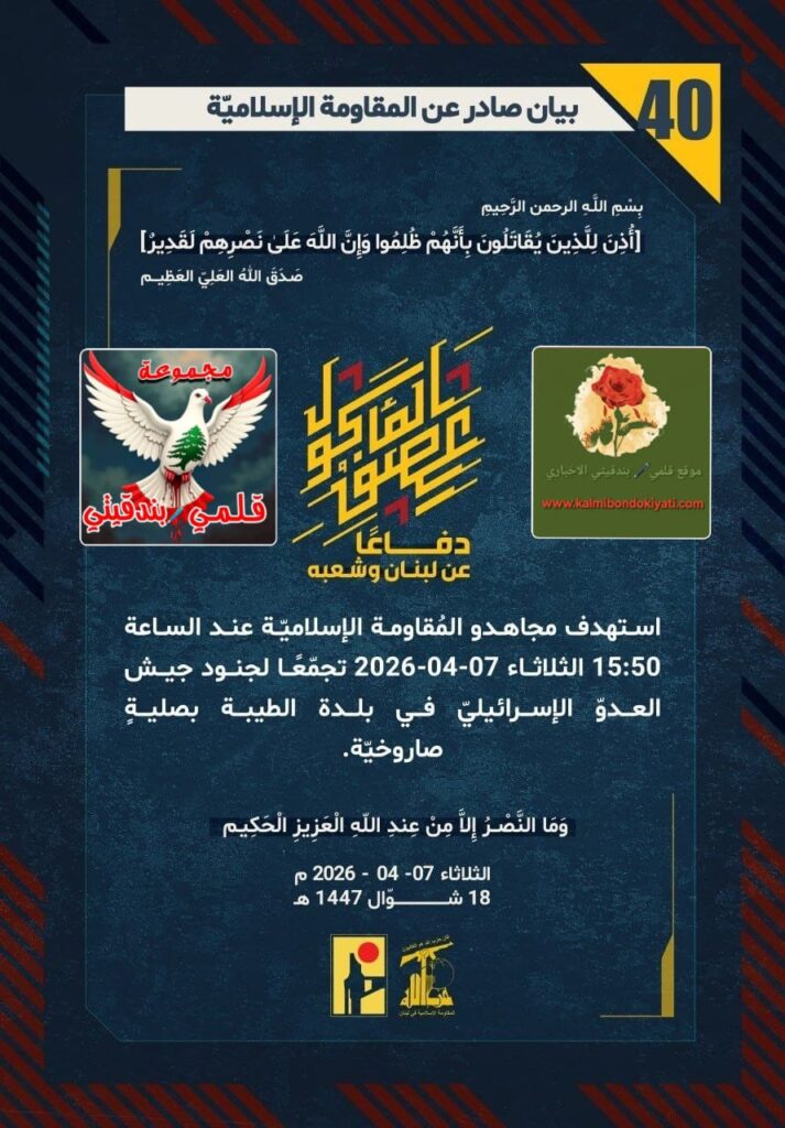 ๐ุตุฏุฑ ุจูุงู ุฑูู “39” ููู ูุงูู ุฉ ุงูุงุณูุงู ูุฉ ุงูุขุชู ูุตู:”ุฏูุงุนูุง ุนู ูุจูุงู ูุดุนุจูุ ุดูู ู ุฌุงูุฏู ุงูู ููุงูู ุฉ ุงูุฅุณูุงู ููุฉ ุนูุฏ ุงูุณุงุนุฉ 13:20 ุงูุซูุงุซุงุก 07-04-2026 ูุฌูู ูุง ุฌููููุง ุจุฃุณุฑุงุจู ู ู ุงูู ูุณููุฑุงุช ุงูุงููุถุงุถููุฉ ุนูู ุชุฌู ุนุงุช ุฌููุฏ ุฌูุด ุงูุนุฏูู ุงูุฅุณุฑุงุฆูููู ูู ู ููุน ุงูู ุทูุฉ ูุซููุฉ ููุชุงุญ.