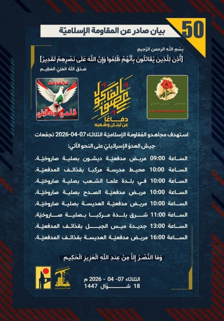 โ€‹๐Ÿ›‘ ุตุฏุฑ ุจูŠุงู† ุฑู‚ู… (50) ู„ู„ู…ู‚ุงูˆู…ุฉ ุงู„ุฅุณู„ุงู…ูŠุฉ ุงู„ุขุชูŠ ู†ุตู‡:”ุฏูุงุนู‹ุง ุนู† ู„ุจู†ุงู† ูˆุดุนุจู‡ุŒ ุงุณุชู‡ุฏู ู…ุฌุงู‡ุฏูˆ ุงู„ู…ูู‚ุงูˆู…ุฉ ุงู„ุฅุณู„ุงู…ูŠู‘ุฉ ุงู„ุซู„ุงุซุงุก 07-04-2026 ุชุฌู…ู‘ุนุงุช ุฌูŠุด ุงู„ุนุฏูˆู‘ ุงู„ุฅุณุฑุงุฆูŠู„ูŠู‘ ุนู„ู‰ ุงู„ู†ุญูˆ ุงู„ุขุชูŠ: