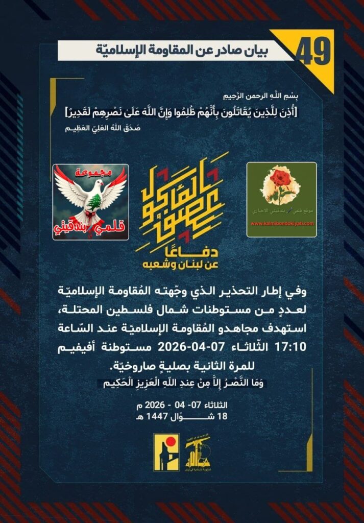 โ€‹๐Ÿ›‘ ุตุฏุฑ ุจูŠุงู† ุฑู‚ู… (49) ู„ู„ู…ู‚ุงูˆู…ุฉ ุงู„ุฅุณู„ุงู…ูŠุฉ ุงู„ุขุชูŠ ู†ุตู‡:”ุฏูุงุนู‹ุง ุนู† ู„ุจู†ุงู† ูˆุดุนุจู‡ุŒ ูˆููŠ ุฅุทุงุฑ โ€ุงู„ุชุญุฐูŠุฑ ุงู„ุฐูŠ ูˆุฌู‘ู‡ุชู‡ ุงู„ู…ูู‚ุงูˆู…ุฉ ุงู„ุฅุณู„ุงู…ูŠู‘ุฉ ู„ุนุฏุฏู ู…ู† ู…ุณุชูˆุทู†ุงุช ุดู…ุงู„ ูู„ุณุทูŠู† ุงู„ู…ุญุชู„ุฉุŒ ุงุณุชู‡ุฏู ู…ุฌุงู‡ุฏูˆ ุงู„ู…ูู‚ุงูˆู…ุฉ ุงู„ุฅุณู„ุงู…ูŠู‘ุฉ ุนู†ุฏ ุงู„ุณู‘ุงุนุฉ 17:10 ุงู„ุซู‘ู„ุงุซุงุก 07-04-2026 ู…ุณุชูˆุทู†ุฉ ุฃููŠููŠู… ู„ู„ู…ุฑุฉ ุงู„ุซุงู†ูŠุฉ ุจุตู„ูŠุฉู ุตุงุฑูˆุฎูŠู‘ุฉ.”