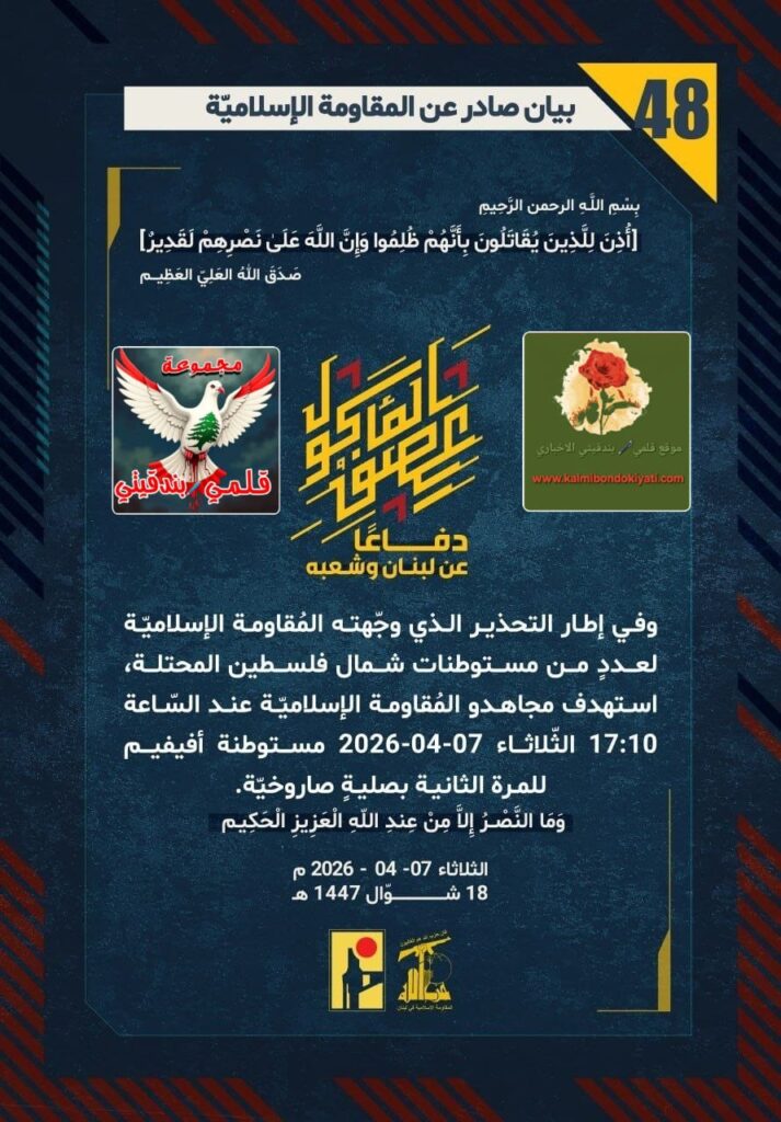 โ€‹๐Ÿ›‘ ุตุฏุฑ ุจูŠุงู† ุฑู‚ู… (48) ู„ู„ู…ู‚ุงูˆู…ุฉ ุงู„ุฅุณู„ุงู…ูŠุฉ ุงู„ุขุชูŠ ู†ุตู‡:”ุฏูุงุนู‹ุง ุนู† ู„ุจู†ุงู† ูˆุดุนุจู‡ุŒ ูˆููŠ ุฅุทุงุฑ โ€ุงู„ุชุญุฐูŠุฑ ุงู„ุฐูŠ ูˆุฌู‘ู‡ุชู‡ ุงู„ู…ูู‚ุงูˆู…ุฉ ุงู„ุฅุณู„ุงู…ูŠู‘ุฉ ู„ุนุฏุฏู ู…ู† ู…ุณุชูˆุทู†ุงุช ุดู…ุงู„ ูู„ุณุทูŠู† ุงู„ู…ุญุชู„ุฉุŒ ุงุณุชู‡ุฏู ู…ุฌุงู‡ุฏูˆ ุงู„ู…ูู‚ุงูˆู…ุฉ ุงู„ุฅุณู„ุงู…ูŠู‘ุฉ ุนู†ุฏ ุงู„ุณู‘ุงุนุฉ 17:10 ุงู„ุซู‘ู„ุงุซุงุก 07-04-2026 ู…ุณุชูˆุทู†ุฉ ุฃููŠููŠู… ู„ู„ู…ุฑุฉ ุงู„ุซุงู†ูŠุฉ ุจุตู„ูŠุฉู ุตุงุฑูˆุฎูŠู‘ุฉ.”