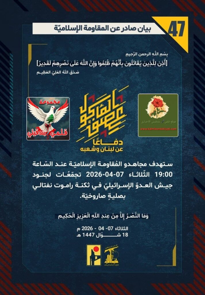 โ€‹๐Ÿ›‘ ุตุฏุฑ ุจูŠุงู† ุฑู‚ู… (47) ู„ู„ู…ู‚ุงูˆู…ุฉ ุงู„ุฅุณู„ุงู…ูŠุฉ ุงู„ุขุชูŠ ู†ุตู‡:”ุฏูุงุนู‹ุง ุนู† ู„ุจู†ุงู† ูˆุดุนุจู‡ุŒ ุงุณุชู‡ุฏู ู…ุฌุงู‡ุฏูˆ ุงู„ู…ูู‚ุงูˆู…ุฉ ุงู„ุฅุณู„ุงู…ูŠู‘ุฉ ุนู†ุฏ ุงู„ุณู‘ุงุนุฉ 19:00 ุงู„ุซู‘ู„ุงุซุงุก 07-04-2026 ุชุฌู…ู‘ุนู‹ุงุช ู„ุฌู†ูˆุฏ ุฌูŠุด ุงู„ุนุฏูˆู‘ ุงู„ุฅุณุฑุงุฆูŠู„ูŠู‘ ููŠ ุซูƒู†ุฉ ุฑุงู…ูˆุช ู†ูุชุงู„ูŠ ุจุตู„ูŠุฉู ุตุงุฑูˆุฎูŠู‘ุฉ.”