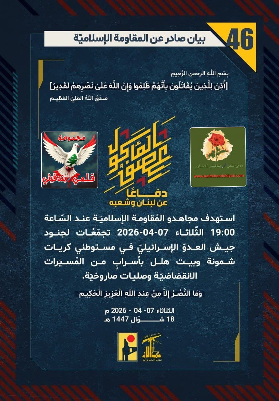 โ€‹๐Ÿ›‘ ุตุฏุฑ ุจูŠุงู† ุฑู‚ู… (46) ู„ู„ู…ู‚ุงูˆู…ุฉ ุงู„ุฅุณู„ุงู…ูŠุฉ ุงู„ุขุชูŠ ู†ุตู‡:”ุฏูุงุนู‹ุง ุนู† ู„ุจู†ุงู† ูˆุดุนุจู‡ุŒ ุงุณุชู‡ุฏู ู…ุฌุงู‡ุฏูˆ ุงู„ู…ูู‚ุงูˆู…ุฉ ุงู„ุฅุณู„ุงู…ูŠู‘ุฉ ุนู†ุฏ ุงู„ุณู‘ุงุนุฉ 19:00 ุงู„ุซู‘ู„ุงุซุงุก 07-04-2026 ุชุฌู…ู‘ุนู‹ุงุช ู„ุฌู†ูˆุฏ ุฌูŠุด ุงู„ุนุฏูˆู‘ ุงู„ุฅุณุฑุงุฆูŠู„ูŠู‘ ููŠ ู…ุณุชูˆุทู†ูŠ ูƒุฑูŠุงุช ุดู…ูˆู†ุฉ ูˆุจูŠุช ู‡ู„ู„ ุจุฃุณุฑุงุจู ู…ู† ุงู„ู…ูุณูŠู‘ุฑุงุช ุงู„ุงู†ู‚ุถุงุถูŠู‘ุฉ ูˆุตู„ูŠุงุช ุตุงุฑูˆุฎูŠู‘ุฉ.”