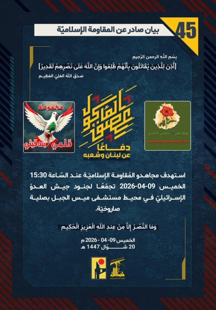 🛑 صدر بيان رقم (45) للمقاومة الإسلامية الآتي نصه:”دفاعًا عن لبنان وشعبه، استهدف مجاهدو المُقاومة الإسلاميّة عند السّاعة 15:30 الخميس 09-04-2026 تجمّعًا لجنود جيش العدوّ الإسرائيليّ في محيط مستشفى ميس الجبل بصلية صاروخيّة.”