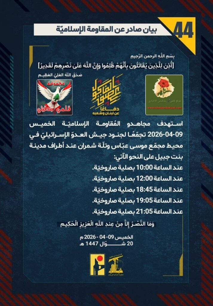 🛑 صدر بيان رقم (44) للمقاومة الإسلامية الآتي نصه:”دفاعًا عن لبنان وشعبه، استهدف مجاهدو المُقاومة الإسلاميّة الخميس 09-04-2026 تجمّعًا لجنود جيش العدوّ الإسرائيليّ في محيط مجمّع موسى عبّاس وتلّة شمران عند أطراف مدينة بنت جبيل على النحو الآتي: