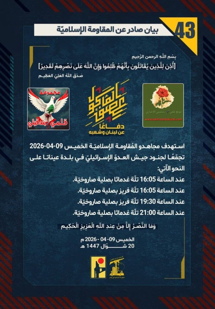 🛑 صدر بيان رقم (43) للمقاومة الإسلامية الآتي نصه:”دفاعًا عن لبنان وشعبه، استهدف مجاهدو المُقاومة الإسلاميّة الخميس 09-04-2026 تجمّعًا لجنود جيش العدوّ الإسرائيليّ في بلدة عيناتا على النحو الآتي: