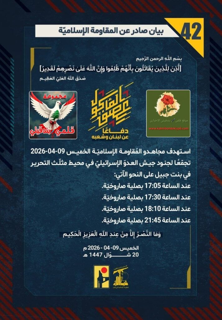 🛑 صدر بيان رقم (42) للمقاومة الإسلامية الآتي نصه:”دفاعًا عن لبنان وشعبه، استهدف مجاهدو المُقاومة الإسلاميّة الخميس 09-04-2026 تجمّعًا لجنود جيش العدوّ الإسرائيليّ في محيط مثلّث التحرير عند أطراف مدينة بنت جبيل على النحو الآتي: