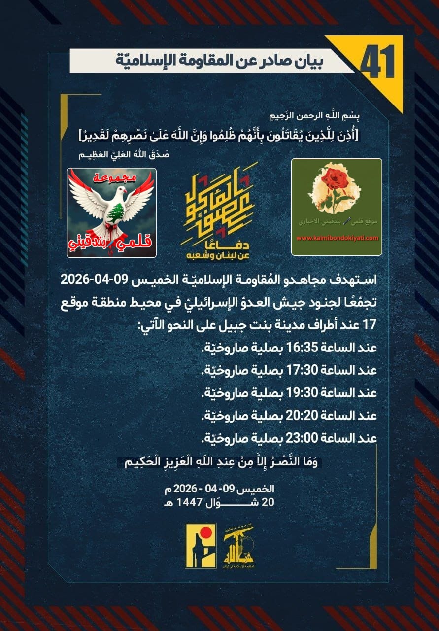 🛑 صدر بيان رقم (41) للمقاومة الإسلامية الآتي نصه:”دفاعًا عن لبنان وشعبه، استهدف مجاهدو المُقاومة الإسلاميّة الخميس 09-04-2026 تجمّعًا لجنود جيش العدوّ الإسرائيليّ في محيط منطقة موقع 17 عند أطراف مدينة بنت جبيل على النحو الآتي: