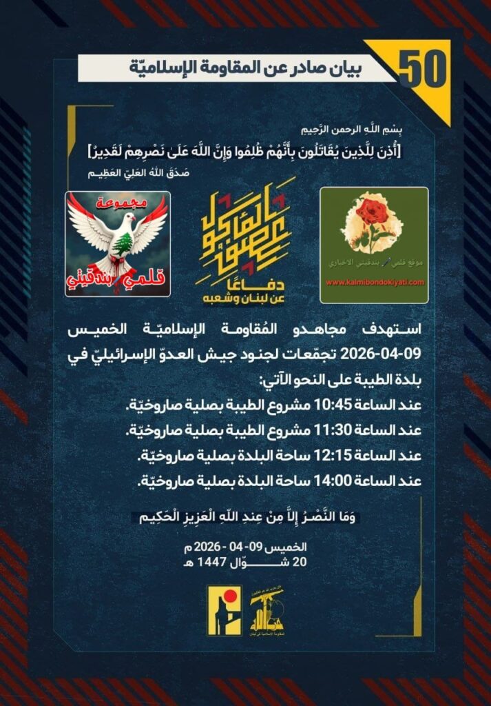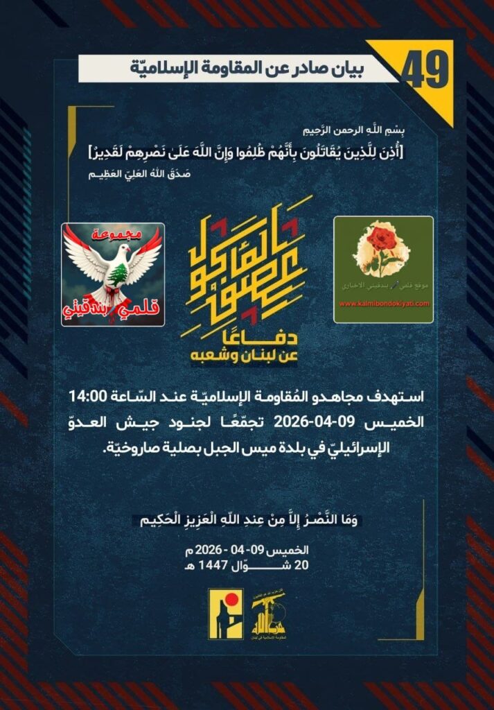 โ๐ ุตุฏุฑ ุจูุงู ุฑูู (49) ููู ูุงูู ุฉ ุงูุฅุณูุงู ูุฉ ุงูุขุชู ูุตู: “ุฏูุงุนูุง ุนู ูุจูุงู ูุดุนุจูุ ุงุณุชูุฏู ู ุฌุงูุฏู ุงูู ููุงูู ุฉ ุงูุฅุณูุงู ููุฉ ุนูุฏ ุงูุณูุงุนุฉ 14:00 ุงูุฎู ูุณ 09-04-2026 ุชุฌู ูุนูุง ูุฌููุฏ ุฌูุด ุงูุนุฏูู ุงูุฅุณุฑุงุฆูููู ูู ุจูุฏุฉ ู ูุณ ุงูุฌุจู ุจุตููุฉ ุตุงุฑูุฎููุฉ.”