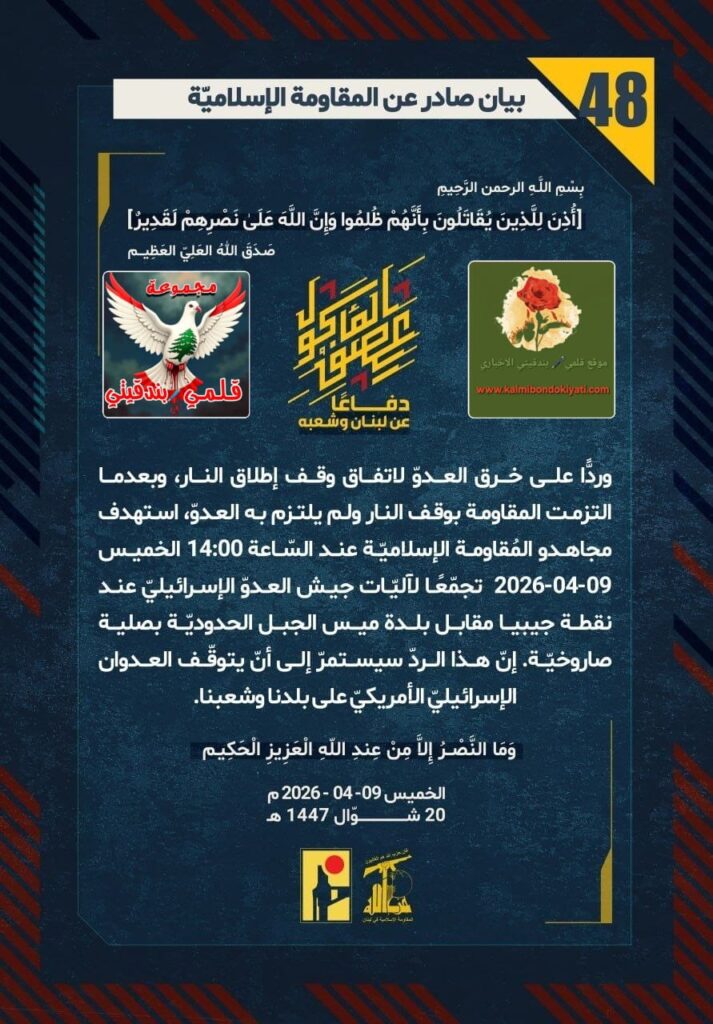 โ๐ ุตุฏุฑ ุจูุงู ุฑูู (48) ููู ูุงูู ุฉ ุงูุฅุณูุงู ูุฉ ุงูุขุชู ูุตู: “ุฏูุงุนูุง ุนู ูุจูุงู ูุดุนุจูุ ูุฑุฏููุง ุนูู ุฎุฑู ุงูุนุฏูู ูุงุชูุงู ููู ุฅุทูุงู ุงููุงุฑุ ูุจุนุฏู ุง ุงูุชุฒู ุช ุงูู ูุงูู ุฉ ุจููู ุงููุงุฑ ููู ููุชุฒู ุจู ุงูุนุฏููุ ุงุณุชูุฏู ู ุฌุงูุฏู ุงูู ููุงูู ุฉ ุงูุฅุณูุงู ููุฉ ุนูุฏ ุงูุณูุงุนุฉ 14:00 ุงูุฎู ูุณ 09-04-2026 ุชุฌู ูุนูุง ูุขูููุงุช ุฌูุด ุงูุนุฏูู ุงูุฅุณุฑุงุฆูููู ุนูุฏ ููุทุฉ ุฌูุจูุง ู ูุงุจู ุจูุฏุฉ ู ูุณ ุงูุฌุจู ุงูุญุฏูุฏููุฉ ุจุตููุฉ ุตุงุฑูุฎููุฉ. ุฅูู ูุฐุง ุงูุฑุฏู ุณูุณุชู ุฑู ุฅูู ุฃูู ูุชูููู ุงูุนุฏูุงู ุงูุฅุณุฑุงุฆูููู ุงูุฃู ุฑูููู ุนูู ุจูุฏูุง ูุดุนุจูุง.”