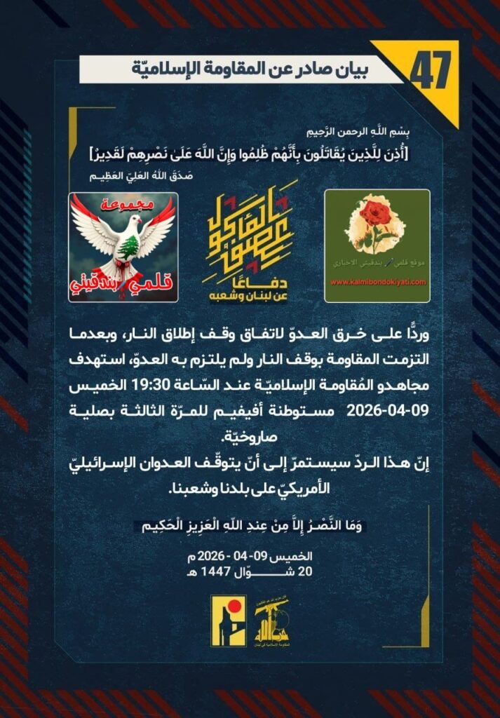 โ๐ ุตุฏุฑ ุจูุงู ุฑูู (47) ููู ูุงูู ุฉ ุงูุฅุณูุงู ูุฉ ุงูุขุชู ูุตู: “ุฏูุงุนูุง ุนู ูุจูุงู ูุดุนุจูุ ูุฑุฏููุง ุนูู ุฎุฑู ุงูุนุฏูู ูุงุชูุงู ููู ุฅุทูุงู ุงููุงุฑุ ูุจุนุฏู ุง ุงูุชุฒู ุช ุงูู ูุงูู ุฉ ุจููู ุงููุงุฑ ููู ููุชุฒู ุจู ุงูุนุฏููุ ุงุณุชูุฏู ู ุฌุงูุฏู ุงูู ููุงูู ุฉ ุงูุฅุณูุงู ููุฉ ุนูุฏ ุงูุณูุงุนุฉ 19:30 ุงูุฎู ูุณ 09-04-2026 ู ุณุชูุทูุฉ ุฃููููู ููู ุฑูุฉ ุงูุซุงูุซุฉ ุจุตููุฉ ุตุงุฑูุฎููุฉ. ุฅูู ูุฐุง ุงูุฑุฏู ุณูุณุชู ุฑู ุฅูู ุฃูู ูุชูููู ุงูุนุฏูุงู ุงูุฅุณุฑุงุฆูููู ุงูุฃู ุฑูููู ุนูู ุจูุฏูุง ูุดุนุจูุง.”
