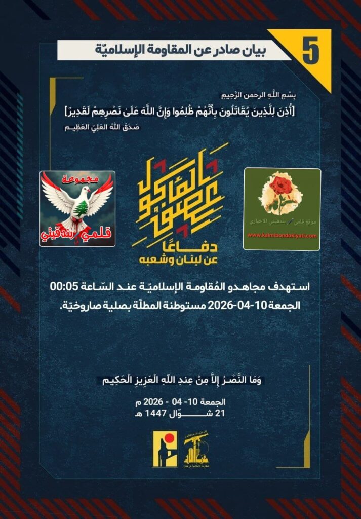 โ๐ ุตุฏุฑ ุจูุงู ุฑูู (5) ููู ูุงูู ุฉ ุงูุฅุณูุงู ูุฉ ุงูุขุชู ูุตู: “ุฏูุงุนูุง ุนู ูุจูุงู ูุดุนุจูุ ุงุณุชูุฏู ู ุฌุงูุฏู ุงูู ููุงูู ุฉ ุงูุฅุณูุงู ููุฉ ุนูุฏ ุงูุณูุงุนุฉ 00:05 ุงูุฌู ุนุฉ 10-04-2026 ู ุณุชูุทูุฉ ุงูู ุทููุฉ ุจุตููุฉ ุตุงุฑูุฎููุฉ.”