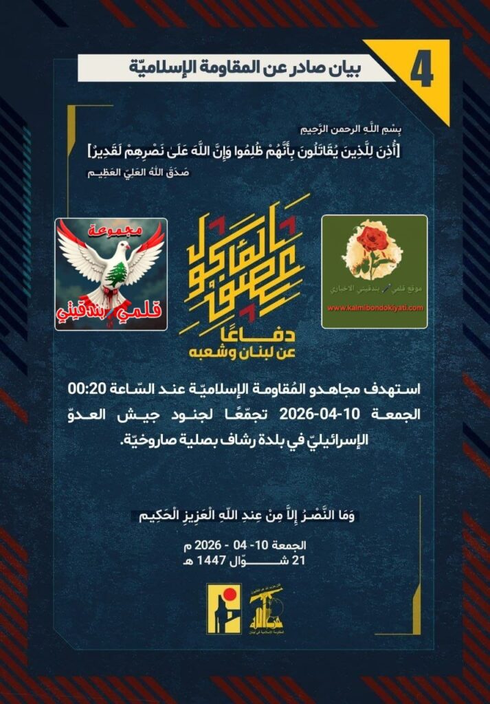 โ๐ ุตุฏุฑ ุจูุงู ุฑูู (4) ููู ูุงูู ุฉ ุงูุฅุณูุงู ูุฉ ุงูุขุชู ูุตู: “ุฏูุงุนูุง ุนู ูุจูุงู ูุดุนุจูุ ุงุณุชูุฏู ู ุฌุงูุฏู ุงูู ููุงูู ุฉ ุงูุฅุณูุงู ููุฉ ุนูุฏ ุงูุณูุงุนุฉ 00:20 ุงูุฌู ุนุฉ 10-04-2026 ุชุฌู ูุนูุง ูุฌููุฏ ุฌูุด ุงูุนุฏูู ุงูุฅุณุฑุงุฆูููู ูู ุจูุฏุฉ ุฑุดุงู ุจุตููุฉ ุตุงุฑูุฎููุฉ.”