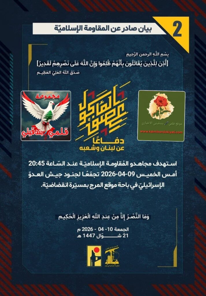 โ๐ ุตุฏุฑ ุจูุงู ุฑูู (1) ููู ูุงูู ุฉ ุงูุฅุณูุงู ูุฉ ุงูุขุชู ูุตู: “ุฏูุงุนูุง ุนู ูุจูุงู ูุดุนุจูุ ุงุณุชูุฏู ู ุฌุงูุฏู ุงูู ููุงูู ุฉ ุงูุฅุณูุงู ููุฉ ุนูุฏ ุงูุณูุงุนุฉ 23:00 ุฃู ุณ ุงูุฎู ูุณ 09-04-2026 ุชุฌู ูุนูุง ูุฌููุฏ ุฌูุด ุงูุนุฏูู ุงูุฅุณุฑุงุฆูููู ูู ู ุนุชูู ุงูุฎูุงู ุจุตููุฉ ุตุงุฑูุฎููุฉ.”