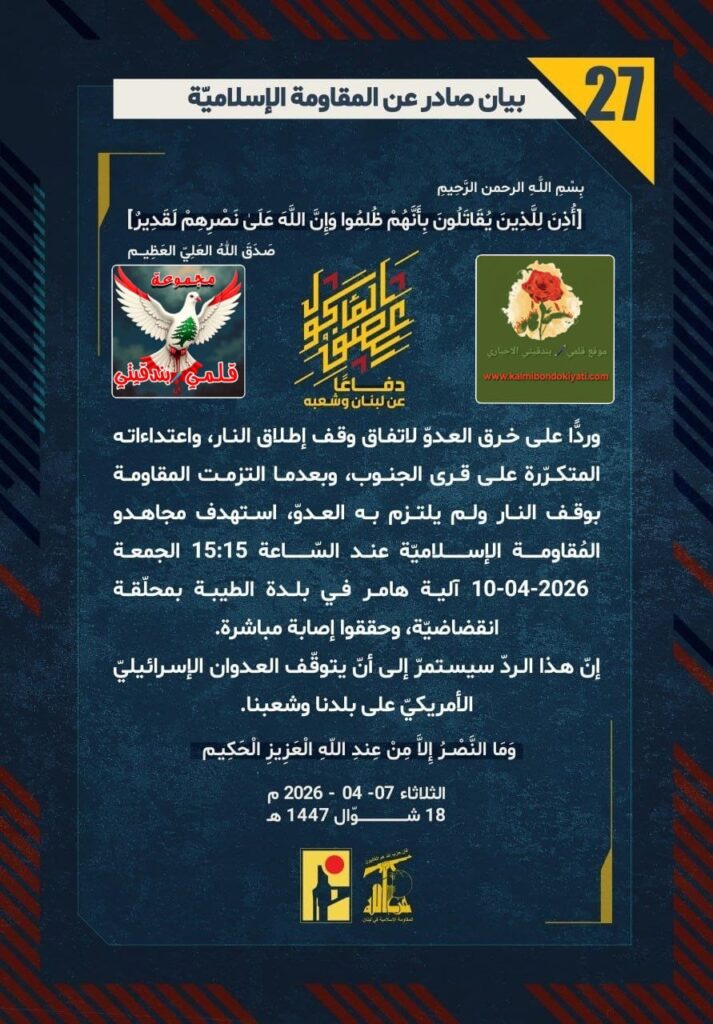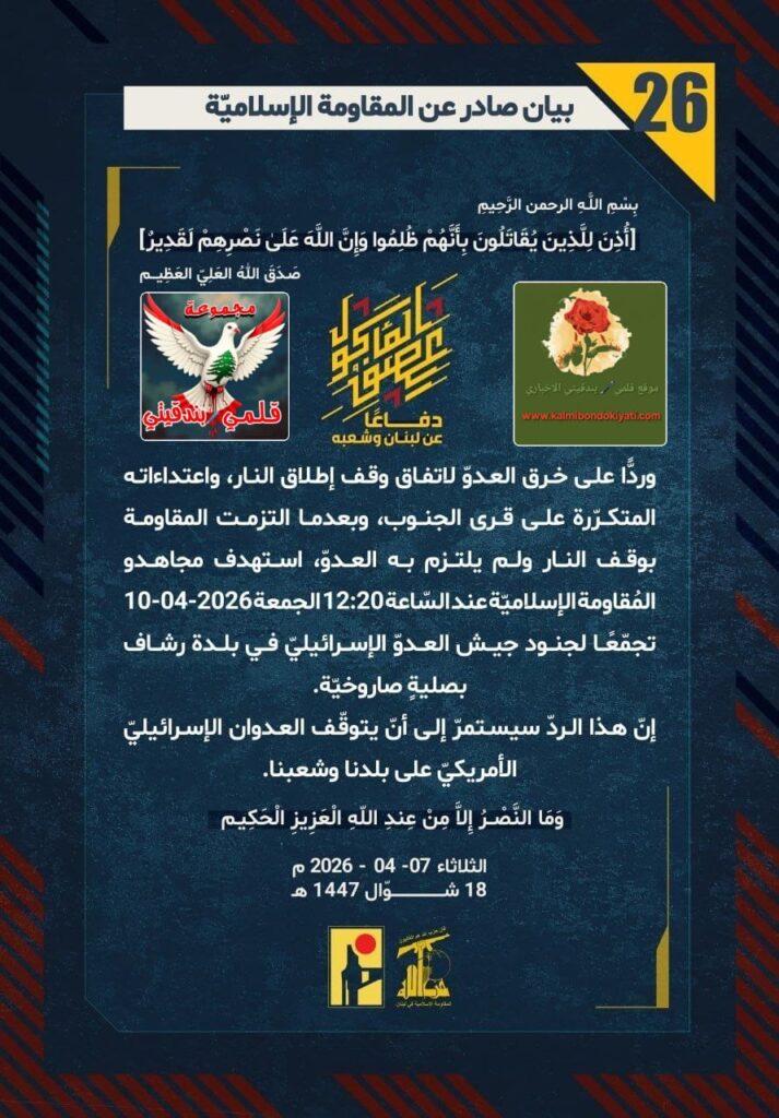 โ๐ ุตุฏุฑ ุจูุงู ุฑูู (26) ููู ูุงูู ุฉ ุงูุฅุณูุงู ูุฉ ุงูุขุชู ูุตู: “ุฏูุงุนูุง ุนู ูุจูุงู ูุดุนุจูุ ูุฑุฏููุง ุนูู ุฎุฑู ุงูุนุฏูู ูุงุชูุงู ููู ุฅุทูุงู ุงููุงุฑุ ูุงุนุชุฏุงุกุงุชู ุงูู ุชูุฑูุฑุฉ ุนูู ูุฑู ุงูุฌููุจุ ูุจุนุฏู ุง ุงูุชุฒู ุช ุงูู ูุงูู ุฉ ุจููู ุงููุงุฑ ููู ููุชุฒู ุจู ุงูุนุฏููุ ุงุณุชูุฏู ู ุฌุงูุฏู ุงูู ููุงูู ุฉ ุงูุฅุณูุงู ููุฉ ุนูุฏ ุงูุณูุงุนุฉ 12:20 ุงูุฌู ุนุฉ 10-04-2026 ุชุฌู ูุนูุง ูุฌููุฏ ุฌูุด ุงูุนุฏูู ุงูุฅุณุฑุงุฆูููู ูู ุจูุฏุฉ ุฑุดุงู ุจุตููุฉู ุตุงุฑูุฎููุฉ. ุฅูู ูุฐุง ุงูุฑุฏู ุณูุณุชู ุฑู ุฅูู ุฃูู ูุชูููู ุงูุนุฏูุงู ุงูุฅุณุฑุงุฆูููู ุงูุฃู ุฑูููู ุนูู ุจูุฏูุง ูุดุนุจูุง.”