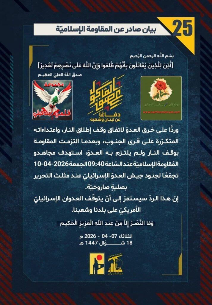 โ๐ ุตุฏุฑ ุจูุงู ุฑูู (25) ููู ูุงูู ุฉ ุงูุฅุณูุงู ูุฉ ุงูุขุชู ูุตู: “ุฏูุงุนูุง ุนู ูุจูุงู ูุดุนุจูุ ูุฑุฏููุง ุนูู ุฎุฑู ุงูุนุฏูู ูุงุชูุงู ููู ุฅุทูุงู ุงููุงุฑุ ูุงุนุชุฏุงุกุงุชู ุงูู ุชูุฑูุฑุฉ ุนูู ูุฑู ุงูุฌููุจุ ูุจุนุฏู ุง ุงูุชุฒู ุช ุงูู ูุงูู ุฉ ุจููู ุงููุงุฑ ููู ููุชุฒู ุจู ุงูุนุฏููุ ุงุณุชูุฏู ู ุฌุงูุฏู ุงูู ููุงูู ุฉ ุงูุฅุณูุงู ููุฉ ุนูุฏ ุงูุณูุงุนุฉ 09:40 ุงูุฌู ุนุฉ 10-04-2026 ุชุฌู ูุนูุง ูุฌููุฏ ุฌูุด ุงูุนุฏูู ุงูุฅุณุฑุงุฆูููู ุนูุฏ ู ุซูุซ ุงูุชุญุฑูุฑ ุนูู ุฃุทุฑุงู ู ุฏููุฉ ุจูุช ุฌุจูู ุจุตููุฉู ุตุงุฑูุฎููุฉ. ุฅูู ูุฐุง ุงูุฑุฏู ุณูุณุชู ุฑู ุฅูู ุฃูู ูุชูููู ุงูุนุฏูุงู ุงูุฅุณุฑุงุฆูููู ุงูุฃู ุฑูููู ุนูู ุจูุฏูุง ูุดุนุจูุง.”