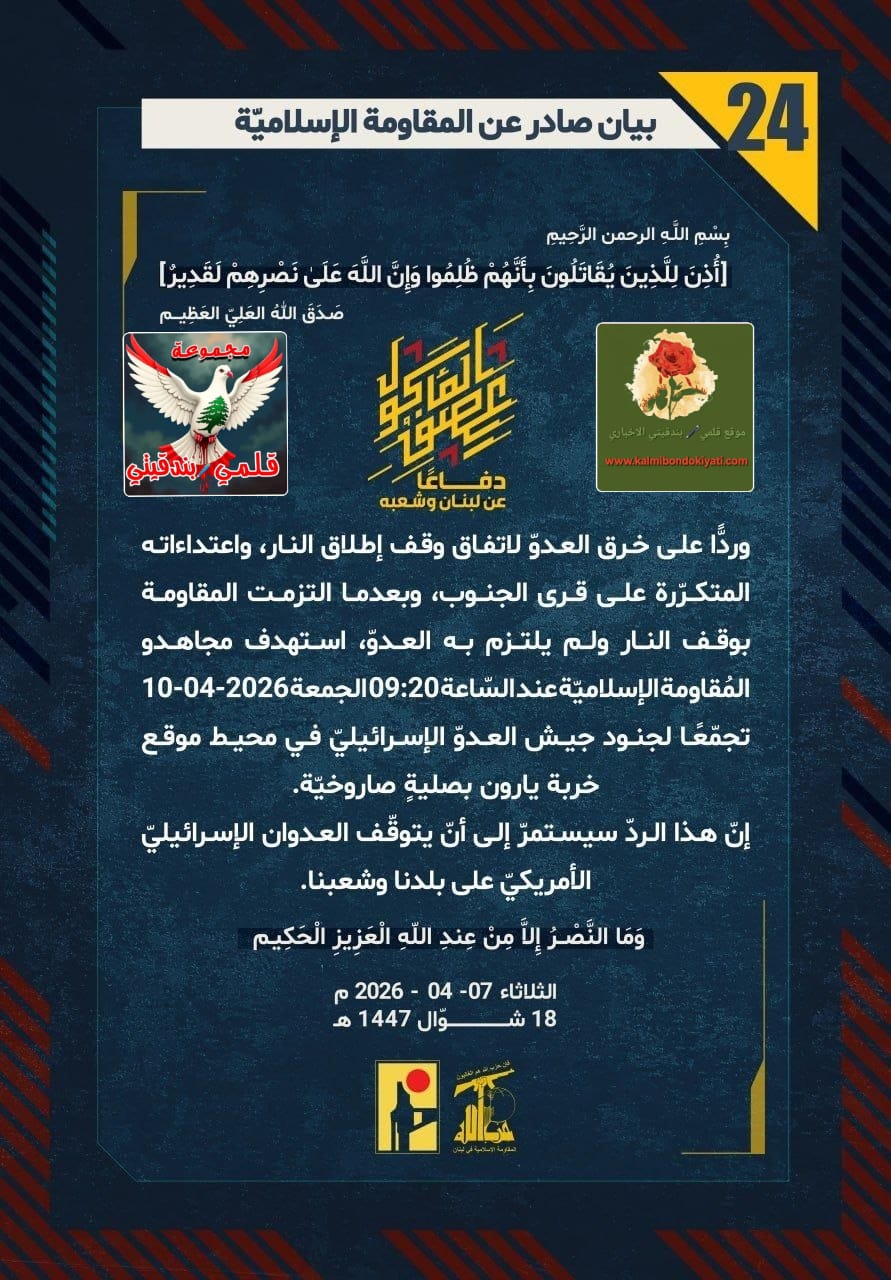 โ๐ ุตุฏุฑ ุจูุงู ุฑูู (24) ููู ูุงูู ุฉ ุงูุฅุณูุงู ูุฉ ุงูุขุชู ูุตู: “ุฏูุงุนูุง ุนู ูุจูุงู ูุดุนุจูุ ูุฑุฏููุง ุนูู ุฎุฑู ุงูุนุฏูู ูุงุชูุงู ููู ุฅุทูุงู ุงููุงุฑุ ูุงุนุชุฏุงุกุงุชู ุงูู ุชูุฑูุฑุฉ ุนูู ูุฑู ุงูุฌููุจุ ูุจุนุฏู ุง ุงูุชุฒู ุช ุงูู ูุงูู ุฉ ุจููู ุงููุงุฑ ููู ููุชุฒู ุจู ุงูุนุฏููุ ุงุณุชูุฏู ู ุฌุงูุฏู ุงูู ููุงูู ุฉ ุงูุฅุณูุงู ููุฉ ุนูุฏ ุงูุณูุงุนุฉ 09:20 ุงูุฌู ุนุฉ 10-04-2026 ุชุฌู ูุนูุง ูุฌููุฏ ุฌูุด ุงูุนุฏูู ุงูุฅุณุฑุงุฆูููู ูู ู ุญูุท ู ููุน ุฎุฑุจุฉ ูุงุฑูู ุจุตููุฉู ุตุงุฑูุฎููุฉ. ุฅูู ูุฐุง ุงูุฑุฏู ุณูุณุชู ุฑู ุฅูู ุฃูู ูุชูููู ุงูุนุฏูุงู ุงูุฅุณุฑุงุฆูููู ุงูุฃู ุฑูููู ุนูู ุจูุฏูุง ูุดุนุจูุง.”