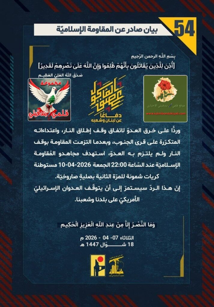 ๐ุฃุตุฏุฑุช ุงูู ูุงูู ุฉ ุงูุงุณูุงู ูุฉ ุจุนุฏ ุงูุจูุงู ุฑูู “53” ู ุจุงุดุฑุฉ ุจูุงู ุฑูู “54” :โุฏูุงุนูุง ุนู ูุจูุงู ูุดุนุจูุ ูุฑุฏููุง ุนูู ุฎุฑู ุงูุนุฏูู ูุงุชูุงู ููู ุฅุทูุงู ุงููุงุฑุ ูุงุนุชุฏุงุกุงุชู ุงูู ุชูุฑูุฑุฉ ุนูู ูุฑู ุงูุฌููุจุ ูุจุนุฏู ุง ุงูุชุฒู ุช ุงูู ูุงูู ุฉ ุจููู ุงููุงุฑ ููู ููุชุฒู ุจู ุงูุนุฏููุ ุงุณุชูุฏู ู ุฌุงูุฏู ุงูู ููุงูู ุฉ ุงูุฅุณูุงู ููุฉ ุนูุฏ ุงูุณูุงุนุฉ 22:00 ุงูุฌู ุนุฉ 10-04-2026 ู ุณุชูุทูุฉ ูุฑูุงุช ุดู ููุฉ ููู ุฑูุฉ ุงูุซุงููุฉ ุจุตููุฉู ุตุงุฑูุฎููุฉ.ุฅูู ูุฐุง ุงูุฑุฏู ุณูุณุชู ุฑู ุฅูู ุฃูู ูุชูููู ุงูุนุฏูุงู ุงูุฅุณุฑุงุฆูููู ุงูุฃู ุฑูููู ุนูู ุจูุฏูุง ูุดุนุจูุง.