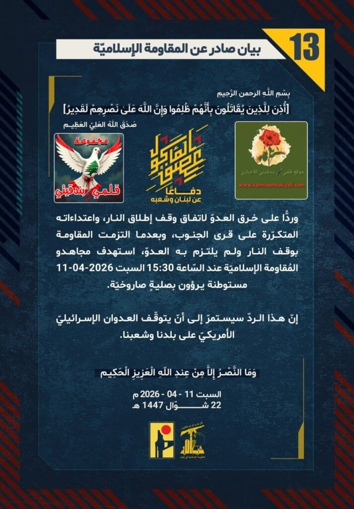 โ๐ ุตุฏุฑ ุจูุงู ุฑูู (13) ููู ูุงูู ุฉ ุงูุฅุณูุงู ูุฉ ุงูุขุชู ูุตู: “ุฏูุงุนูุง ุนู ูุจูุงู ูุดุนุจูุ ูุฑุฏููุง ุนูู ุฎุฑู ุงูุนุฏูู ูุงุชูุงู ููู ุฅุทูุงู ุงููุงุฑุ ูุงุนุชุฏุงุกุงุชู ุงูู ุชูุฑูุฑุฉ ุนูู ูุฑู ุงูุฌููุจุ ูุจุนุฏู ุง ุงูุชุฒู ุช ุงูู ูุงูู ุฉ ุจููู ุงููุงุฑ ููู ููุชุฒู ุจู ุงูุนุฏููุ ุงุณุชูุฏู ู ุฌุงูุฏู ุงูู ููุงูู ุฉ ุงูุฅุณูุงู ููุฉ ุนูุฏ ุงูุณูุงุนุฉ 15:30 ุงูุณุจุช 11-04-2026 ู ุณุชูุทูุฉ ูุฑุคูู ุจุตููุฉู ุตุงุฑูุฎููุฉ. ุฅูู ูุฐุง ุงูุฑุฏู ุณูุณุชู ุฑู ุฅูู ุฃูู ูุชูููู ุงูุนุฏูุงู ุงูุฅุณุฑุงุฆูููู ุงูุฃู ุฑูููู ุนูู ุจูุฏูุง ูุดุนุจูุง.”