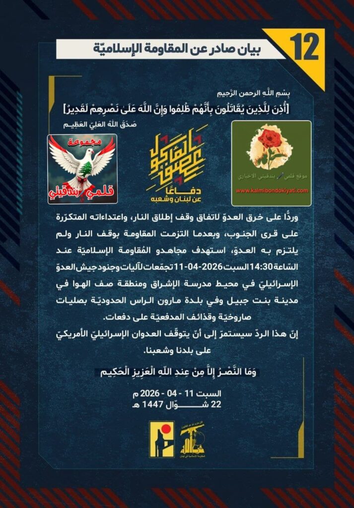 โ๐ ุตุฏุฑ ุจูุงู ุฑูู (12) ููู ูุงูู ุฉ ุงูุฅุณูุงู ูุฉ ุงูุขุชู ูุตู: “ุฏูุงุนูุง ุนู ูุจูุงู ูุดุนุจูุ ูุฑุฏููุง ุนูู ุฎุฑู ุงูุนุฏูู ูุงุชูุงู ููู ุฅุทูุงู ุงููุงุฑุ ูุงุนุชุฏุงุกุงุชู ุงูู ุชูุฑูุฑุฉ ุนูู ูุฑู ุงูุฌููุจุ ูุจุนุฏู ุง ุงูุชุฒู ุช ุงูู ูุงูู ุฉ ุจููู ุงููุงุฑ ููู ููุชุฒู ุจู ุงูุนุฏููุ ุงุณุชูุฏู ู ุฌุงูุฏู ุงูู ููุงูู ุฉ ุงูุฅุณูุงู ููุฉ ุนูุฏ ุงูุณูุงุนุฉ 14:30 ุงูุณุจุช 11-04-2026 ุชุฌู ูุนุงุช ูุขููุงุช ูุฌููุฏ ุฌูุด ุงูุนุฏูู ุงูุฅุณุฑุงุฆูููู ูู ู ุญูุท ู ุฏุฑุณุฉ ุงูุฅุดุฑุงู ูู ูุทูุฉ ุตู ุงูููุง ูู ู ุฏููุฉ ุจูุช ุฌุจูู ููู ุจูุฏุฉ ู ุงุฑูู ุงูุฑุงุณ ุงูุญุฏูุฏููุฉ ุจุตููุงุช ุตุงุฑูุฎููุฉ ููุฐุงุฆู ุงูู ุฏูุนููุฉ ุนูู ุฏูุนุงุช. ุฅูู ูุฐุง ุงูุฑุฏู ุณูุณุชู ุฑู ุฅูู ุฃูู ูุชูููู ุงูุนุฏูุงู ุงูุฅุณุฑุงุฆูููู ุงูุฃู ุฑูููู ุนูู ุจูุฏูุง ูุดุนุจูุง.”
