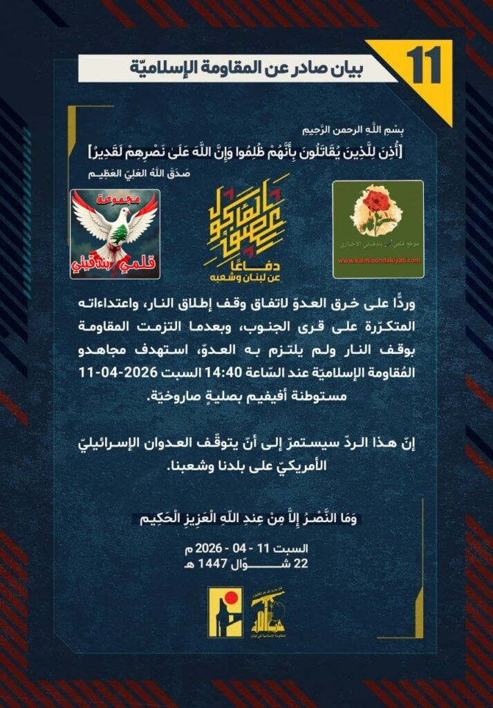 โ๐ ุตุฏุฑ ุจูุงู ุฑูู (11) ููู ูุงูู ุฉ ุงูุฅุณูุงู ูุฉ ุงูุขุชู ูุตู: “ุฏูุงุนูุง ุนู ูุจูุงู ูุดุนุจูุ ูุฑุฏููุง ุนูู ุฎุฑู ุงูุนุฏูู ูุงุชูุงู ููู ุฅุทูุงู ุงููุงุฑุ ูุงุนุชุฏุงุกุงุชู ุงูู ุชูุฑูุฑุฉ ุนูู ูุฑู ุงูุฌููุจุ ูุจุนุฏู ุง ุงูุชุฒู ุช ุงูู ูุงูู ุฉ ุจููู ุงููุงุฑ ููู ููุชุฒู ุจู ุงูุนุฏููุ ุงุณุชูุฏู ู ุฌุงูุฏู ุงูู ููุงูู ุฉ ุงูุฅุณูุงู ููุฉ ุนูุฏ ุงูุณูุงุนุฉ 14:40 ุงูุณุจุช 11-04-2026 ู ุณุชูุทูุฉ ุฃููููู ุจุตููุฉู ุตุงุฑูุฎููุฉ. ุฅูู ูุฐุง ุงูุฑุฏู ุณูุณุชู ุฑู ุฅูู ุฃูู ูุชูููู ุงูุนุฏูุงู ุงูุฅุณุฑุงุฆูููู ุงูุฃู ุฑูููู ุนูู ุจูุฏูุง ูุดุนุจูุง.”