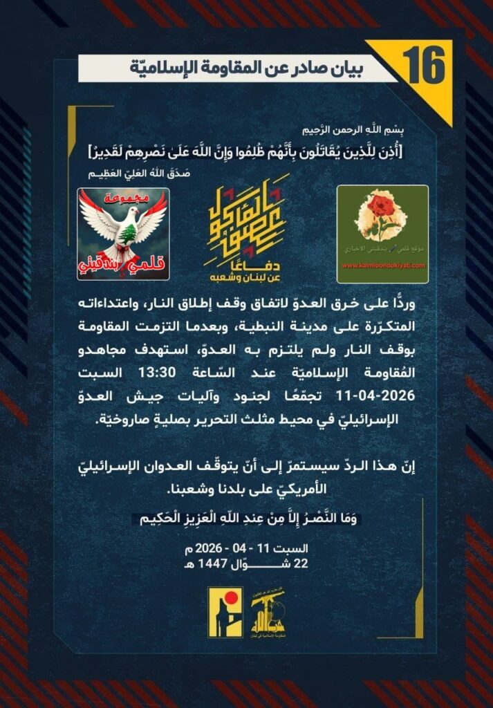 ๐ุฃุตุฏุฑุช ุงูู ูุงูู ุฉ ุงูุงุณูุงู ูุฉ ุจุนุฏ ุงูุจูุงู ุฑูู ’15’ ู ุจุงุดุฑุฉ ุจูุงู ุฑูู ’16’ :โุฏูุงุนูุง ุนู ูุจูุงู ูุดุนุจูุ ูุฑุฏููุง ุนูู ุฎุฑู ุงูุนุฏูู ูุงุชูุงู ููู ุฅุทูุงู ุงููุงุฑุ ูุงุนุชุฏุงุกุงุชู ุงูู ุชูุฑูุฑุฉ ุนูู ู ุฏููุฉ ุงููุจุทูุฉุ ูุจุนุฏู ุง ุงูุชุฒู ุช ุงูู ูุงูู ุฉ ุจููู ุงููุงุฑ ููู ููุชุฒู ุจู ุงูุนุฏููุ ุงุณุชูุฏู ู ุฌุงูุฏู ุงูู ููุงูู ุฉ ุงูุฅุณูุงู ููุฉ ุนูุฏ ุงูุณูุงุนุฉ 13:30 ุงูุณุจุช 11-04-2026 ุชุฌู ูุนูุง ูุฌููุฏ ูุขููุงุช ุฌูุด ุงูุนุฏูู ุงูุฅุณุฑุงุฆูููู ูู ู ุญูุท ู ุซูุซ ุงูุชุญุฑูุฑ ุจุตููุฉู ุตุงุฑูุฎููุฉ.ุฅูู ูุฐุง ุงูุฑุฏู ุณูุณุชู ุฑู ุฅูู ุฃูู ูุชูููู ุงูุนุฏูุงู ุงูุฅุณุฑุงุฆูููู ุงูุฃู ุฑูููู ุนูู ุจูุฏูุง ูุดุนุจูุง.