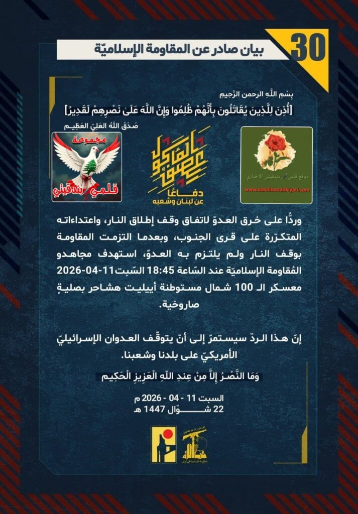 โ๐ ุตุฏุฑ ุจูุงู ุฑูู (30) ููู ูุงูู ุฉ ุงูุฅุณูุงู ูุฉ ุงูุขุชู ูุตู: “ุฏูุงุนูุง ุนู ูุจูุงู ูุดุนุจูุ ูุฑุฏููุง ุนูู ุฎุฑู ุงูุนุฏูู ูุงุชูุงู ููู ุฅุทูุงู ุงููุงุฑุ ูุงุนุชุฏุงุกุงุชู ุงูู ุชูุฑูุฑุฉ ุนูู ูุฑู ุงูุฌููุจุ ูุจุนุฏู ุง ุงูุชุฒู ุช ุงูู ูุงูู ุฉ ุจููู ุงููุงุฑ ููู ููุชุฒู ุจู ุงูุนุฏููุ ุงุณุชูุฏู ู ุฌุงูุฏู ุงูู ููุงูู ุฉ ุงูุฅุณูุงู ููุฉ ุนูุฏ ุงูุณูุงุนุฉ 18:45 ุงูุณูุจุช 11-04-2026 ู ุนุณูุฑ ุงูู 100 ุดู ุงู ู ุณุชูุทูุฉ ุฃููููุช ูุดุงุญุฑ ุจุตููุฉู ุตุงุฑูุฎูุฉ. ุฅูู ูุฐุง ุงูุฑุฏู ุณูุณุชู ุฑู ุฅูู ุฃูู ูุชูููู ุงูุนุฏูุงู ุงูุฅุณุฑุงุฆูููู ุงูุฃู ุฑูููู ุนูู ุจูุฏูุง ูุดุนุจูุง.”