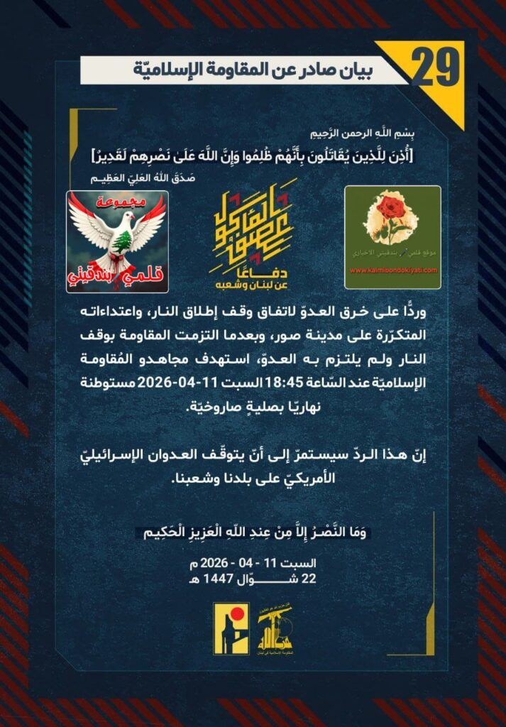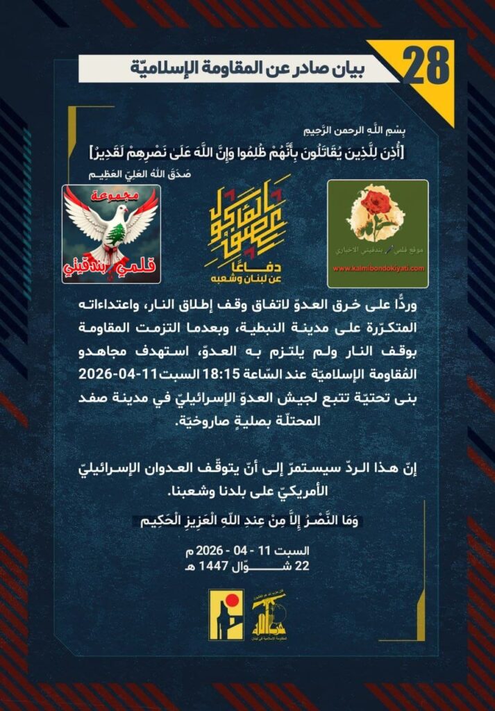 โ๐ ุตุฏุฑ ุจูุงู ุฑูู (28) ููู ูุงูู ุฉ ุงูุฅุณูุงู ูุฉ ุงูุขุชู ูุตู: “ุฏูุงุนูุง ุนู ูุจูุงู ูุดุนุจูุ ูุฑุฏููุง ุนูู ุฎุฑู ุงูุนุฏูู ูุงุชูุงู ููู ุฅุทูุงู ุงููุงุฑุ ูุงุนุชุฏุงุกุงุชู ุงูู ุชูุฑูุฑุฉ ุนูู ู ุฏููุฉ ุงููุจุทูุฉุ ูุจุนุฏู ุง ุงูุชุฒู ุช ุงูู ูุงูู ุฉ ุจููู ุงููุงุฑ ููู ููุชุฒู ุจู ุงูุนุฏููุ ุงุณุชูุฏู ู ุฌุงูุฏู ุงูู ููุงูู ุฉ ุงูุฅุณูุงู ููุฉ ุนูุฏ ุงูุณูุงุนุฉ 18:15 ุงูุณุจุช 11-04-2026 ุจูู ุชุญุชููุฉ ุชุชุจุน ูุฌูุด ุงูุนุฏูู ุงูุฅุณุฑุงุฆูููู ูู ู ุฏููุฉ ุตูุฏ ุงูู ุญุชููุฉ ุจุตููุฉู ุตุงุฑูุฎููุฉ. ุฅูู ูุฐุง ุงูุฑุฏู ุณูุณุชู ุฑู ุฅูู ุฃูู ูุชูููู ุงูุนุฏูุงู ุงูุฅุณุฑุงุฆูููู ุงูุฃู ุฑูููู ุนูู ุจูุฏูุง ูุดุนุจูุง.”
