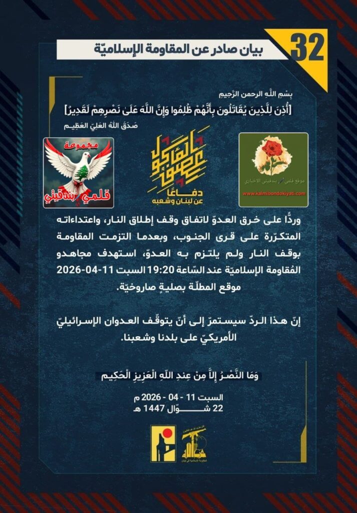 ๐ุฃุตุฏุฑุช ุงูู ูุงูู ุฉ ุงูุงุณูุงู ูุฉ ุจุนุฏ ุงูุจูุงู ุฑูู “31” ู ุจุงุดุฑุฉ ุจูุงู ุฑูู “32” :โุฏูุงุนูุง ุนู ูุจูุงู ูุดุนุจูุ ูุฑุฏููุง ุนูู ุฎุฑู ุงูุนุฏูู ูุงุชูุงู ููู ุฅุทูุงู ุงููุงุฑุ ูุงุนุชุฏุงุกุงุชู ุงูู ุชูุฑูุฑุฉ ุนูู ูุฑู ุงูุฌููุจุ ูุจุนุฏู ุง ุงูุชุฒู ุช ุงูู ูุงูู ุฉ ุจููู ุงููุงุฑ ููู ููุชุฒู ุจู ุงูุนุฏููุ ุงุณุชูุฏู ู ุฌุงูุฏู ุงูู ููุงูู ุฉ ุงูุฅุณูุงู ููุฉ ุนูุฏ ุงูุณูุงุนุฉ 19:20 ุงูุณุจุช 11-04-2026 ู ููุน ุงูู ุทููุฉ ุจุตููุฉู ุตุงุฑูุฎููุฉ.ุฅูู ูุฐุง ุงูุฑุฏู ุณูุณุชู ุฑู ุฅูู ุฃูู ูุชูููู ุงูุนุฏูุงู ุงูุฅุณุฑุงุฆูููู ุงูุฃู ุฑูููู ุนูู ุจูุฏูุง ูุดุนุจูุง.