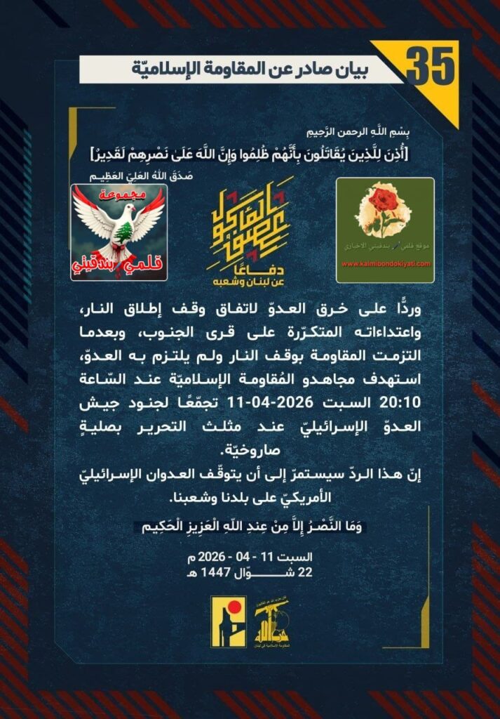 ๐ โุตุฏุฑ ุจูุงู ุฑูู (35) ููู ูุงูู ุฉ ุงูุฅุณูุงู ูุฉ ุงูุขุชู ูุตู:ุฏูุงุนูุง ุนู ูุจูุงู ูุดุนุจูุ ูุฑุฏููุง ุนูู ุฎุฑู ุงูุนุฏูู ูุงุชูุงู ููู ุฅุทูุงู ุงููุงุฑุ ูุงุนุชุฏุงุกุงุชู ุงูู ุชูุฑูุฑุฉ ุนูู ูุฑู ุงูุฌููุจุ ูุจุนุฏู ุง ุงูุชุฒู ุช ุงูู ูุงูู ุฉ ุจููู ุงููุงุฑ ููู ููุชุฒู ุจู ุงูุนุฏููุ ุงุณุชูุฏู ู ุฌุงูุฏู ุงูู ููุงูู ุฉ ุงูุฅุณูุงู ููุฉ ุนูุฏ ุงูุณูุงุนุฉ 20:10 ุงูุณุจุช 11-04-2026 ุชุฌู ูุนูุง ูุฌููุฏ ุฌูุด ุงูุนุฏูู ุงูุฅุณุฑุงุฆูููู ุนูุฏ ู ุซูุซ ุงูุชุญุฑูุฑ ุจุตููุฉู ุตุงุฑูุฎููุฉ.