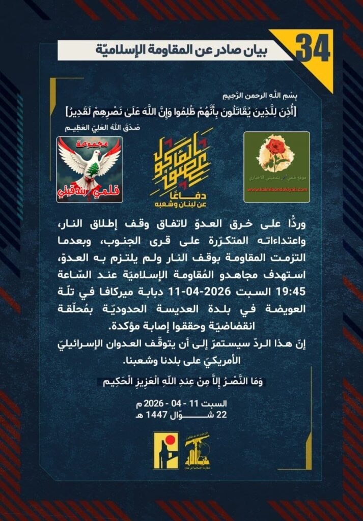 ๐โุตุฏุฑ ุจูุงู ุฑูู (34) ููู ูุงูู ุฉ ุงูุฅุณูุงู ูุฉ ุงูุขุชู ูุตู: ุฏูุงุนูุง ุนู ูุจูุงู ูุดุนุจูุ ูุฑุฏููุง ุนูู ุฎุฑู ุงูุนุฏูู ูุงุชูุงู ููู ุฅุทูุงู ุงููุงุฑุ ูุงุนุชุฏุงุกุงุชู ุงูู ุชูุฑูุฑุฉ ุนูู ูุฑู ุงูุฌููุจุ ูุจุนุฏู ุง ุงูุชุฒู ุช ุงูู ูุงูู ุฉ ุจููู ุงููุงุฑ ููู ููุชุฒู ุจู ุงูุนุฏููุ ุงุณุชูุฏู ู ุฌุงูุฏู ุงูู ููุงูู ุฉ ุงูุฅุณูุงู ููุฉ ุนูุฏ ุงูุณูุงุนุฉ 19:45 ุงูุณุจุช 11-04-2026 ุฏุจุงุจุฉ ู ูุฑูุงูุง ูู ุชููุฉ ุงูุนููุถุฉ ูู ุจูุฏุฉ ุงูุนุฏูุณุฉ ุงูุญุฏูุฏููุฉ ุจู ูุญูููุฉ ุงููุถุงุถููุฉ ูุญูููุง ุฅุตุงุจุฉ ู ุคูุฏุฉ.