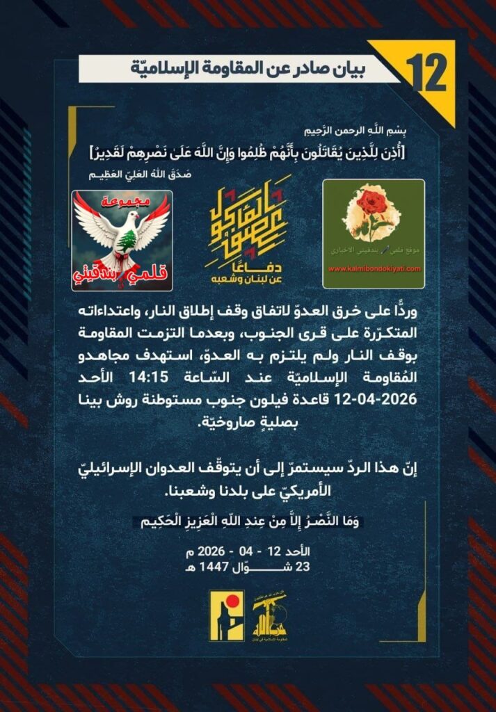 โ๐ ุตุฏุฑ ุจูุงู ุฑูู (12) ููู ูุงูู ุฉ ุงูุงุณูุงู ูุฉ ุงูุขุชู ูุตู:”ุฏูุงุนูุง ุนู ูุจูุงู ูุดุนุจูุ ูุฑุฏููุง ุนูู ุฎุฑู ุงูุนุฏูู ูุงุชูุงู ููู ุฅุทูุงู ุงููุงุฑุ ูุงุนุชุฏุงุกุงุชู ุงูู ุชูุฑูุฑุฉ ุนูู ูุฑู ุงูุฌููุจุ ูุจุนุฏู ุง ุงูุชุฒู ุช ุงูู ูุงูู ุฉ ุจููู ุงููุงุฑ ููู ููุชุฒู ุจู ุงูุนุฏููุ ุงุณุชูุฏู ู ุฌุงูุฏู ุงูู ููุงูู ุฉ ุงูุฅุณูุงู ููุฉ ุนูุฏ ุงูุณูุงุนุฉ 14:15 ุงูุฃุญุฏ 12-04-2026 ูุงุนุฏุฉ ููููู ุฌููุจ ู ุณุชูุทูุฉ ุฑูุด ุจููุง ุจุตููุฉู ุตุงุฑูุฎููุฉ.ุฅูู ูุฐุง ุงูุฑุฏู ุณูุณุชู ุฑู ุฅูู ุฃู ูุชูููู ุงูุนุฏูุงู ุงูุฅุณุฑุงุฆูููู ุงูุฃู ุฑูููู ุนูู ุจูุฏูุง ูุดุนุจูุง.