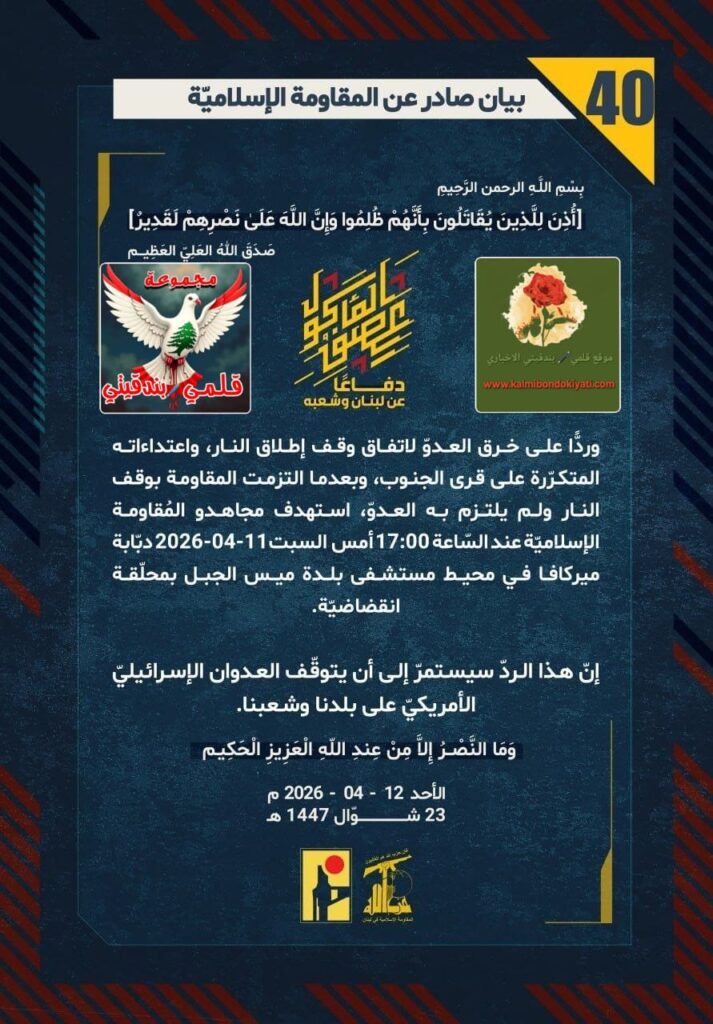 โ€‹๐Ÿ›‘ ุตุฏุฑ ุจูŠุงู† ุฑู‚ู… (40) ู„ู„ู…ู‚ุงูˆู…ุฉ ุงู„ุฅุณู„ุงู…ูŠุฉ ุงู„ุขุชูŠ ู†ุตู‡:”ุฏูุงุนู‹ุง ุนู† ู„ุจู†ุงู† ูˆุดุนุจู‡ุŒ ูˆุฑุฏู‘ู‹ุง ุนู„ู‰ ุฎุฑู‚ ุงู„ุนุฏูˆู‘ ู„ุงุชูุงู‚ ูˆู‚ู ุฅุทู„ุงู‚ ุงู„ู†ุงุฑุŒ ูˆุงุนุชุฏุงุกุงุชู‡ ุงู„ู…ุชูƒุฑู‘ุฑุฉ ุนู„ู‰ ู‚ุฑู‰ ุงู„ุฌู†ูˆุจุŒ ูˆุจุนุฏู…ุง ุงู„ุชุฒู…ุช ุงู„ู…ู‚ุงูˆู…ุฉ ุจูˆู‚ู ุงู„ู†ุงุฑ ูˆู„ู… ูŠู„ุชุฒู… ุจู‡ ุงู„ุนุฏูˆู‘ุŒ ุงุณุชู‡ุฏู ู…ุฌุงู‡ุฏูˆ ุงู„ู…ูู‚ุงูˆู…ุฉ ุงู„ุฅุณู„ุงู…ูŠู‘ุฉ ุนู†ุฏ ุงู„ุณู‘ุงุนุฉ 17:00 ุฃู…ุณ ุงู„ุณุจุช 11-04-2026 ุฏุจู‘ุงุจุฉ ู…ูŠุฑูƒุงูุง ููŠ ู…ุญูŠุท ู…ุณุชุดูู‰ ุจู„ุฏุฉ ู…ูŠุณ ุงู„ุฌุจู„ ุจู…ุญู„ู‘ู‚ุฉ ุงู†ู‚ุถุงุถูŠู‘ุฉ. ุฅู†ู‘ ู‡ุฐุง ุงู„ุฑุฏู‘ ุณูŠุณุชู…ุฑู‘ ุฅู„ู‰ ุฃู† ูŠุชูˆู‚ู‘ู ุงู„ุนุฏูˆุงู† ุงู„ุฅุณุฑุงุฆูŠู„ูŠู‘ ุงู„ุฃู…ุฑูŠูƒูŠู‘ ุนู„ู‰ ุจู„ุฏู†ุง ูˆุดุนุจู†ุง.”