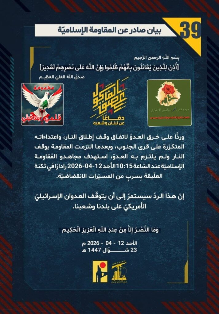โ€‹๐Ÿ›‘ ุตุฏุฑ ุจูŠุงู† ุฑู‚ู… (39) ู„ู„ู…ู‚ุงูˆู…ุฉ ุงู„ุฅุณู„ุงู…ูŠุฉ ุงู„ุขุชูŠ ู†ุตู‡:”ุฏูุงุนู‹ุง ุนู† ู„ุจู†ุงู† ูˆุดุนุจู‡ุŒ ูˆุฑุฏู‘ู‹ุง ุนู„ู‰ ุฎุฑู‚ ุงู„ุนุฏูˆู‘ ู„ุงุชูุงู‚ ูˆู‚ู ุฅุทู„ุงู‚ ุงู„ู†ุงุฑุŒ ูˆุงุนุชุฏุงุกุงุชู‡ ุงู„ู…ุชูƒุฑู‘ุฑุฉ ุนู„ู‰ ู‚ุฑู‰ ุงู„ุฌู†ูˆุจุŒ ูˆุจุนุฏู…ุง ุงู„ุชุฒู…ุช ุงู„ู…ู‚ุงูˆู…ุฉ ุจูˆู‚ู ุงู„ู†ุงุฑ ูˆู„ู… ูŠู„ุชุฒู… ุจู‡ ุงู„ุนุฏูˆู‘ุŒ ุงุณุชู‡ุฏู ู…ุฌุงู‡ุฏูˆ ุงู„ู…ูู‚ุงูˆู…ุฉ ุงู„ุฅุณู„ุงู…ูŠู‘ุฉ ุนู†ุฏ ุงู„ุณู‘ุงุนุฉ 10:15 ุงู„ุฃุญุฏ 12-04-2026 ุฑุงุฏุงุฑู‹ุง ููŠ ุซูƒู†ุฉ ุงู„ุนู„ู‘ูŠู‚ุฉ ุจูุณุฑุจู ู…ู† ุงู„ู…ุณูŠู‘ุฑุงุช ุงู„ุงู†ู‚ุถุงุถูŠู‘ุฉ. ุฅู†ู‘ ู‡ุฐุง ุงู„ุฑุฏู‘ ุณูŠุณุชู…ุฑู‘ ุฅู„ู‰ ุฃู† ูŠุชูˆู‚ู‘ู ุงู„ุนุฏูˆุงู† ุงู„ุฅุณุฑุงุฆูŠู„ูŠู‘ ุงู„ุฃู…ุฑูŠูƒูŠู‘ ุนู„ู‰ ุจู„ุฏู†ุง ูˆุดุนุจู†ุง.”