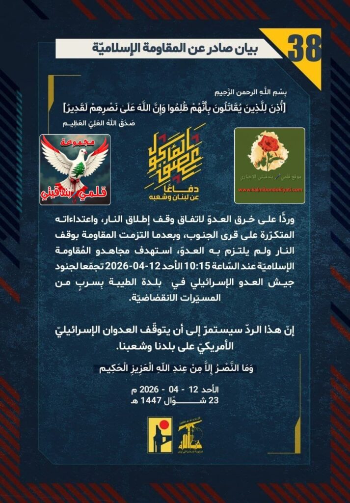 โ€‹๐Ÿ›‘ ุตุฏุฑ ุจูŠุงู† ุฑู‚ู… (38) ู„ู„ู…ู‚ุงูˆู…ุฉ ุงู„ุฅุณู„ุงู…ูŠุฉ ุงู„ุขุชูŠ ู†ุตู‡:”ุฏูุงุนู‹ุง ุนู† ู„ุจู†ุงู† ูˆุดุนุจู‡ุŒ ูˆุฑุฏู‘ู‹ุง ุนู„ู‰ ุฎุฑู‚ ุงู„ุนุฏูˆู‘ ู„ุงุชูุงู‚ ูˆู‚ู ุฅุทู„ุงู‚ ุงู„ู†ุงุฑุŒ ูˆุงุนุชุฏุงุกุงุชู‡ ุงู„ู…ุชูƒุฑู‘ุฑุฉ ุนู„ู‰ ู‚ุฑู‰ ุงู„ุฌู†ูˆุจุŒ ูˆุจุนุฏู…ุง ุงู„ุชุฒู…ุช ุงู„ู…ู‚ุงูˆู…ุฉ ุจูˆู‚ู ุงู„ู†ุงุฑ ูˆู„ู… ูŠู„ุชุฒู… ุจู‡ ุงู„ุนุฏูˆู‘ุŒ ุงุณุชู‡ุฏู ู…ุฌุงู‡ุฏูˆ ุงู„ู…ูู‚ุงูˆู…ุฉ ุงู„ุฅุณู„ุงู…ูŠู‘ุฉ ุนู†ุฏ ุงู„ุณู‘ุงุนุฉ 10:15 ุงู„ุฃุญุฏ 12-04-2026 ุชุฌู…ู‘ุนุง ู„ุฌู†ูˆุฏ ุฌูŠุด ุงู„ุนุฏูˆ ุงู„ุฅุณุฑุงุฆูŠู„ูŠ ููŠ ุจู„ุฏุฉ ุงู„ุทูŠุจุฉ ุจูุณุฑุจู ู…ู† ุงู„ู…ุณูŠู‘ุฑุงุช ุงู„ุงู†ู‚ุถุงุถูŠู‘ุฉ. ุฅู†ู‘ ู‡ุฐุง ุงู„ุฑุฏู‘ ุณูŠุณุชู…ุฑู‘ ุฅู„ู‰ ุฃู† ูŠุชูˆู‚ู‘ู ุงู„ุนุฏูˆุงู† ุงู„ุฅุณุฑุงุฆูŠู„ูŠู‘ ุงู„ุฃู…ุฑูŠูƒูŠู‘ ุนู„ู‰ ุจู„ุฏู†ุง ูˆุดุนุจู†ุง.”