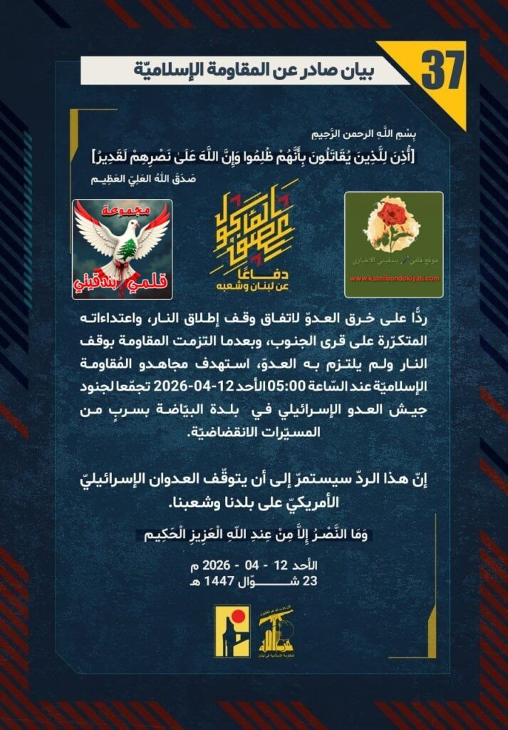 โ€‹๐Ÿ›‘ ุตุฏุฑ ุจูŠุงู† ุฑู‚ู… (37) ู„ู„ู…ู‚ุงูˆู…ุฉ ุงู„ุฅุณู„ุงู…ูŠุฉ ุงู„ุขุชูŠ ู†ุตู‡:”ุฏูุงุนู‹ุง ุนู† ู„ุจู†ุงู† ูˆุดุนุจู‡ุŒ ูˆุฑุฏู‘ู‹ุง ุนู„ู‰ ุฎุฑู‚ ุงู„ุนุฏูˆู‘ ู„ุงุชูุงู‚ ูˆู‚ู ุฅุทู„ุงู‚ ุงู„ู†ุงุฑุŒ ูˆุงุนุชุฏุงุกุงุชู‡ ุงู„ู…ุชูƒุฑู‘ุฑุฉ ุนู„ู‰ ู‚ุฑู‰ ุงู„ุฌู†ูˆุจุŒ ูˆุจุนุฏู…ุง ุงู„ุชุฒู…ุช ุงู„ู…ู‚ุงูˆู…ุฉ ุจูˆู‚ู ุงู„ู†ุงุฑ ูˆู„ู… ูŠู„ุชุฒู… ุจู‡ ุงู„ุนุฏูˆู‘ุŒ ุงุณุชู‡ุฏู ู…ุฌุงู‡ุฏูˆ ุงู„ู…ูู‚ุงูˆู…ุฉ ุงู„ุฅุณู„ุงู…ูŠู‘ุฉ ุนู†ุฏ ุงู„ุณู‘ุงุนุฉ 05:00 ุงู„ุฃุญุฏ 12-04-2026 ุชุฌู…ู‘ุนุง ู„ุฌู†ูˆุฏ ุฌูŠุด ุงู„ุนุฏูˆ ุงู„ุฅุณุฑุงุฆูŠู„ูŠ ููŠ ุจู„ุฏุฉ ุงู„ุจูŠู‘ุงุถุฉ ุจุณุฑุจู ู…ู† ุงู„ู…ุณูŠู‘ุฑุงุช ุงู„ุงู†ู‚ุถุงุถูŠู‘ุฉ. ุฅู†ู‘ ู‡ุฐุง ุงู„ุฑุฏู‘ ุณูŠุณุชู…ุฑู‘ ุฅู„ู‰ ุฃู† ูŠุชูˆู‚ู‘ู ุงู„ุนุฏูˆุงู† ุงู„ุฅุณุฑุงุฆูŠู„ูŠู‘ ุงู„ุฃู…ุฑูŠูƒูŠู‘ ุนู„ู‰ ุจู„ุฏู†ุง ูˆุดุนุจู†ุง.”