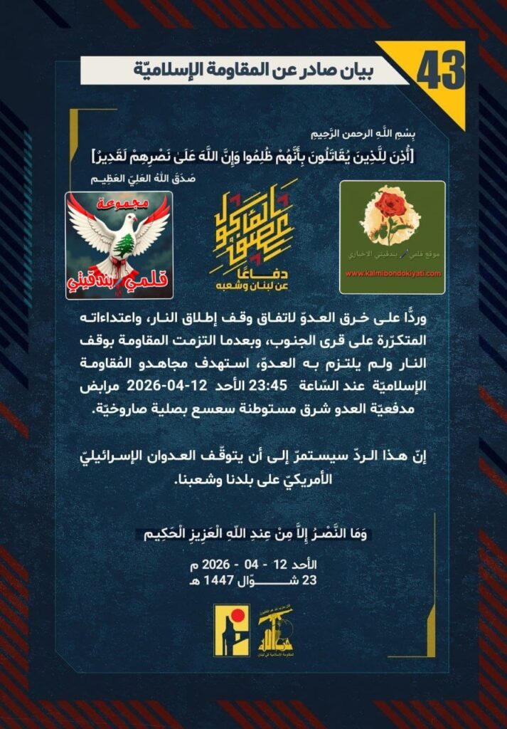 โ๐ ุตุฏุฑ ุจูุงู ุฑูู (43) ููู ูุงูู ุฉ ุงูุฅุณูุงู ูุฉ ุงูุขุชู ูุตู:”ุฏูุงุนูุง ุนู ูุจูุงู ูุดุนุจูุ ูุฑุฏููุง ุนูู ุฎุฑู ุงูุนุฏูู ูุงุชูุงู ููู ุฅุทูุงู ุงููุงุฑุ ูุงุนุชุฏุงุกุงุชู ุงูู ุชูุฑูุฑุฉ ุนูู ูุฑู ุงูุฌููุจุ ูุจุนุฏู ุง ุงูุชุฒู ุช ุงูู ูุงูู ุฉ ุจููู ุงููุงุฑ ููู ููุชุฒู ุจู ุงูุนุฏููุ ุงุณุชูุฏู ู ุฌุงูุฏู ุงูู ููุงูู ุฉ ุงูุฅุณูุงู ููุฉ ุนูุฏ ุงูุณูุงุนุฉ 23:45 ุงูุฃุญุฏ 12-04-2026 ู ุฑุงุจุถ ู ุฏูุนููุฉ ุงูุนุฏู ุดุฑู ู ุณุชูุทูุฉ ุณุนุณุน ุจุตููุฉ ุตุงุฑูุฎููุฉ. ุฅูู ูุฐุง ุงูุฑุฏู ุณูุณุชู ุฑู ุฅูู ุฃู ูุชูููู ุงูุนุฏูุงู ุงูุฅุณุฑุงุฆูููู ุงูุฃู ุฑูููู ุนูู ุจูุฏูุง ูุดุนุจูุง.”