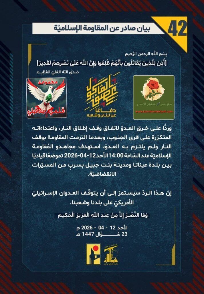 โ๐ ุตุฏุฑ ุจูุงู ุฑูู (42) ููู ูุงูู ุฉ ุงูุฅุณูุงู ูุฉ ุงูุขุชู ูุตู:”ุฏูุงุนูุง ุนู ูุจูุงู ูุดุนุจูุ ูุฑุฏููุง ุนูู ุฎุฑู ุงูุนุฏูู ูุงุชูุงู ููู ุฅุทูุงู ุงููุงุฑุ ูุงุนุชุฏุงุกุงุชู ุงูู ุชูุฑูุฑุฉ ุนูู ูุฑู ุงูุฌููุจุ ูุจุนุฏู ุง ุงูุชุฒู ุช ุงูู ูุงูู ุฉ ุจููู ุงููุงุฑ ููู ููุชุฒู ุจู ุงูุนุฏููุ ุงุณุชูุฏู ู ุฌุงูุฏู ุงูู ููุงูู ุฉ ุงูุฅุณูุงู ููุฉ ุนูุฏ ุงูุณูุงุนุฉ 14:00 ุงูุฃุญุฏ 12-04-2026 ุชู ูุถุนูุง ููุงุฏููุง ุจูู ุจูุฏุฉ ุนููุงุชุง ูู ุฏููุฉ ุจูุช ุฌุจูู ุจูุณุฑุจู ู ู ุงูู ุณููุฑุงุช ุงูุงููุถุงุถููุฉ. ุฅูู ูุฐุง ุงูุฑุฏู ุณูุณุชู ุฑู ุฅูู ุฃู ูุชูููู ุงูุนุฏูุงู ุงูุฅุณุฑุงุฆูููู ุงูุฃู ุฑูููู ุนูู ุจูุฏูุง ูุดุนุจูุง.”