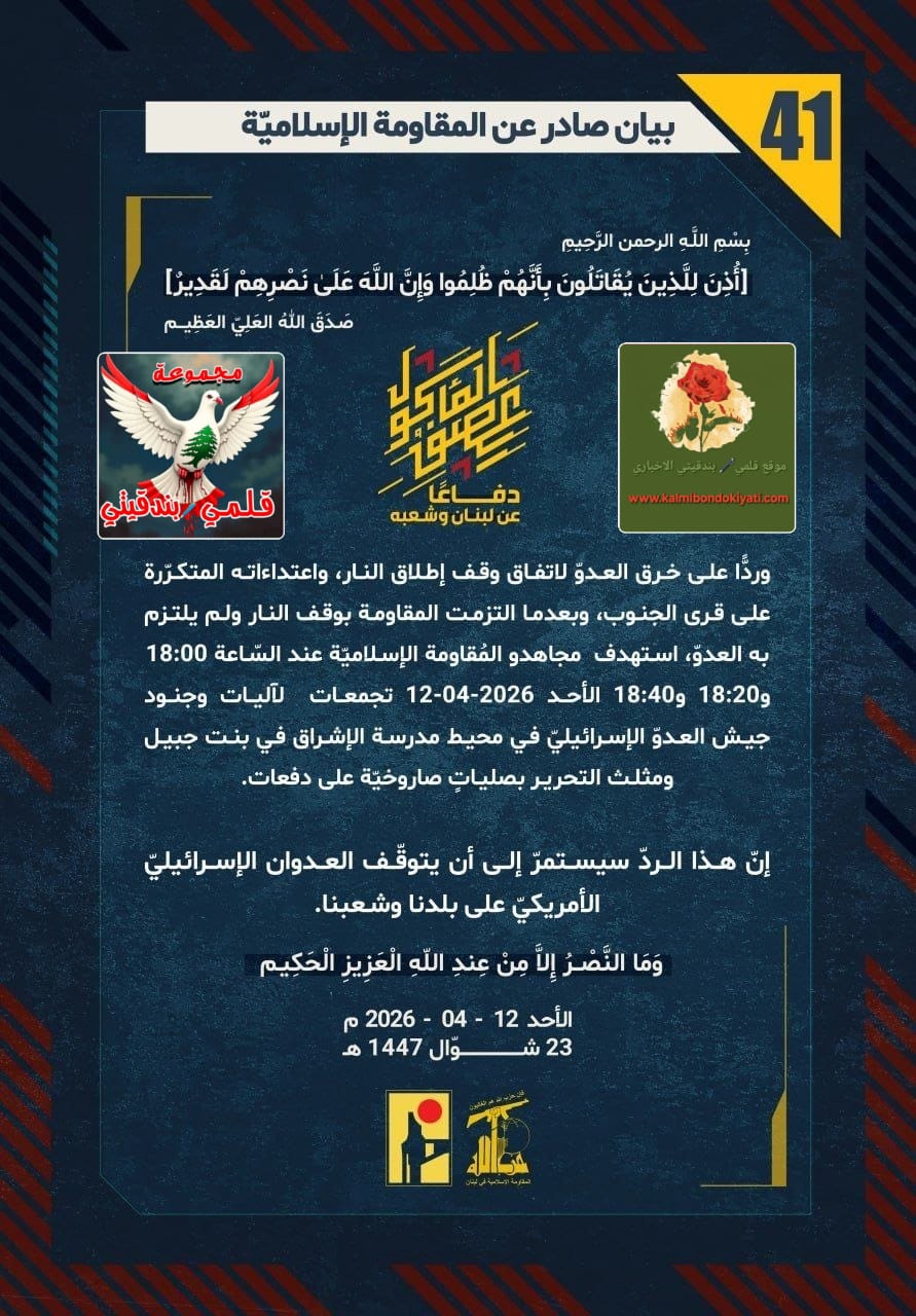 โ๐ ุตุฏุฑ ุจูุงู ุฑูู (41) ููู ูุงูู ุฉ ุงูุฅุณูุงู ูุฉ ุงูุขุชู ูุตู:”ุฏูุงุนูุง ุนู ูุจูุงู ูุดุนุจูุ ูุฑุฏููุง ุนูู ุฎุฑู ุงูุนุฏูู ูุงุชูุงู ููู ุฅุทูุงู ุงููุงุฑุ ูุงุนุชุฏุงุกุงุชู ุงูู ุชูุฑูุฑุฉ ุนูู ูุฑู ุงูุฌููุจุ ูุจุนุฏู ุง ุงูุชุฒู ุช ุงูู ูุงูู ุฉ ุจููู ุงููุงุฑ ููู ููุชุฒู ุจู ุงูุนุฏููุ ุงุณุชูุฏู ู ุฌุงูุฏู ุงูู ููุงูู ุฉ ุงูุฅุณูุงู ููุฉ ุนูุฏ ุงูุณูุงุนุฉ 18:00 ู 18:20 ู 18:40 ุงูุฃุญุฏ 12-04-2026 ุชุฌู ุนุงุช ูุขููุงุช ูุฌููุฏ ุฌูุด ุงูุนุฏูู ุงูุฅุณุฑุงุฆูููู ูู ู ุญูุท ู ุฏุฑุณุฉ ุงูุฅุดุฑุงู ูู ุจูุช ุฌุจูู ูู ุซูุซ ุงูุชุญุฑูุฑ ุจุตููุงุชู ุตุงุฑูุฎููุฉ ุนูู ุฏูุนุงุช. ุฅูู ูุฐุง ุงูุฑุฏู ุณูุณุชู ุฑู ุฅูู ุฃู ูุชูููู ุงูุนุฏูุงู ุงูุฅุณุฑุงุฆูููู ุงูุฃู ุฑูููู ุนูู ุจูุฏูุง ูุดุนุจูุง.”