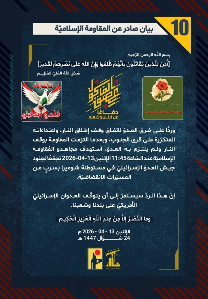 โ๐ ุตุฏุฑ ุจูุงู ุฑูู (10) ููู ูุงูู ุฉ ุงูุฅุณูุงู ูุฉ ุงูุขุชู ูุตู:”ุฏูุงุนูุง ุนู ูุจูุงู ูุดุนุจูุ ูุฑุฏููุง ุนูู ุฎุฑู ุงูุนุฏูู ูุงุชูุงู ููู ุฅุทูุงู ุงููุงุฑุ ูุงุนุชุฏุงุกุงุชู ุงูู ุชูุฑูุฑุฉ ุนูู ูุฑู ุงูุฌููุจุ ูุจุนุฏู ุง ุงูุชุฒู ุช ุงูู ูุงูู ุฉ ุจููู ุงููุงุฑ ููู ููุชุฒู ุจู ุงูุนุฏููุ ุงุณุชูุฏู ู ุฌุงูุฏู ุงูู ููุงูู ุฉ ุงูุฅุณูุงู ููุฉ ุนูุฏ ุงูุณูุงุนุฉ 11:45 ุงูุฅุซููู 13-04-2026 ุชุฌู ูุนูุง ูุฌููุฏ ุฌูุด ุงูุนุฏูู ุงูุฅุณุฑุงุฆูููู ูู ู ุณุชูุทูุฉ ุดูู ูุฑุง ุจุณุฑุจู ู ู ุงูู ุณููุฑุงุช ุงูุงููุถุงุถููุฉ. ุฅูู ูุฐุง ุงูุฑุฏู ุณูุณุชู ุฑู ุฅูู ุฃู ูุชูููู ุงูุนุฏูุงู ุงูุฅุณุฑุงุฆูููู ุงูุฃู ุฑูููู ุนูู ุจูุฏูุง ูุดุนุจูุง.”