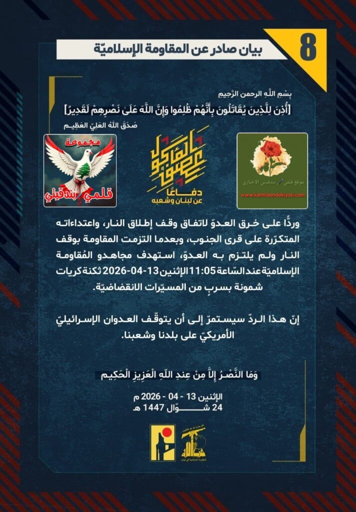 โ๐ ุตุฏุฑ ุจูุงู ุฑูู (8) ููู ูุงูู ุฉ ุงูุฅุณูุงู ูุฉ ุงูุขุชู ูุตู:”ุฏูุงุนูุง ุนู ูุจูุงู ูุดุนุจูุ ูุฑุฏููุง ุนูู ุฎุฑู ุงูุนุฏูู ูุงุชูุงู ููู ุฅุทูุงู ุงููุงุฑุ ูุงุนุชุฏุงุกุงุชู ุงูู ุชูุฑูุฑุฉ ุนูู ูุฑู ุงูุฌููุจุ ูุจุนุฏู ุง ุงูุชุฒู ุช ุงูู ูุงูู ุฉ ุจููู ุงููุงุฑ ููู ููุชุฒู ุจู ุงูุนุฏููุ ุงุณุชูุฏู ู ุฌุงูุฏู ุงูู ููุงูู ุฉ ุงูุฅุณูุงู ููุฉ ุนูุฏ ุงูุณูุงุนุฉ 11:05 ุงูุฅุซููู 13-04-2026 ุซููุฉ ูุฑูุงุช ุดู ููุฉ ุจุณุฑุจู ู ู ุงูู ุณููุฑุงุช ุงูุงููุถุงุถููุฉ. ุฅูู ูุฐุง ุงูุฑุฏู ุณูุณุชู ุฑู ุฅูู ุฃู ูุชูููู ุงูุนุฏูุงู ุงูุฅุณุฑุงุฆูููู ุงูุฃู ุฑูููู ุนูู ุจูุฏูุง ูุดุนุจูุง.”