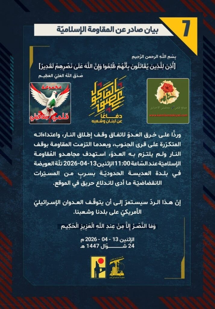 โ๐ ุตุฏุฑ ุจูุงู ุฑูู (7) ููู ูุงูู ุฉ ุงูุฅุณูุงู ูุฉ ุงูุขุชู ูุตู:”ุฏูุงุนูุง ุนู ูุจูุงู ูุดุนุจูุ ูุฑุฏููุง ุนูู ุฎุฑู ุงูุนุฏูู ูุงุชูุงู ููู ุฅุทูุงู ุงููุงุฑุ ูุงุนุชุฏุงุกุงุชู ุงูู ุชูุฑูุฑุฉ ุนูู ูุฑู ุงูุฌููุจุ ูุจุนุฏู ุง ุงูุชุฒู ุช ุงูู ูุงูู ุฉ ุจููู ุงููุงุฑ ููู ููุชุฒู ุจู ุงูุนุฏููุ ุงุณุชูุฏู ู ุฌุงูุฏู ุงูู ููุงูู ุฉ ุงูุฅุณูุงู ููุฉ ุนูุฏ ุงูุณูุงุนุฉ 11:00 ุงูุฅุซููู 13-04-2026 ุชููุฉ ุงูุนููุถุฉ ูู ุจูุฏุฉ ุงูุนุฏูุณุฉ ุงูุญุฏูุฏููุฉ ุจุณุฑุจู ู ู ุงูู ุณููุฑุงุช ุงูุงููุถุงุถููุฉ ู ุง ุฃุฏู ูุงูุฏูุงุน ุญุฑูู ูู ุงูู ููุน. ุฅูู ูุฐุง ุงูุฑุฏู ุณูุณุชู ุฑู ุฅูู ุฃู ูุชูููู ุงูุนุฏูุงู ุงูุฅุณุฑุงุฆูููู ุงูุฃู ุฑูููู ุนูู ุจูุฏูุง ูุดุนุจูุง.”