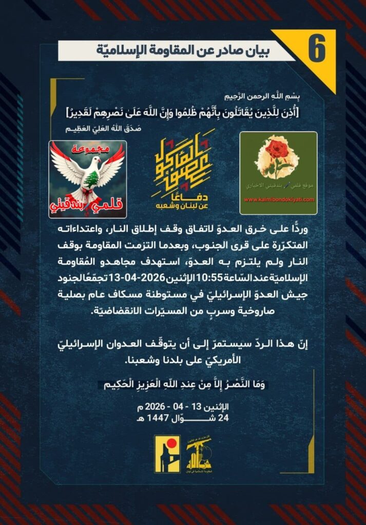 โ๐ ุตุฏุฑ ุจูุงู ุฑูู (6) ููู ูุงูู ุฉ ุงูุฅุณูุงู ูุฉ ุงูุขุชู ูุตู:”ุฏูุงุนูุง ุนู ูุจูุงู ูุดุนุจูุ ูุฑุฏููุง ุนูู ุฎุฑู ุงูุนุฏูู ูุงุชูุงู ููู ุฅุทูุงู ุงููุงุฑุ ูุงุนุชุฏุงุกุงุชู ุงูู ุชูุฑูุฑุฉ ุนูู ูุฑู ุงูุฌููุจุ ูุจุนุฏู ุง ุงูุชุฒู ุช ุงูู ูุงูู ุฉ ุจููู ุงููุงุฑ ููู ููุชุฒู ุจู ุงูุนุฏููุ ุงุณุชูุฏู ู ุฌุงูุฏู ุงูู ููุงูู ุฉ ุงูุฅุณูุงู ููุฉ ุนูุฏ ุงูุณูุงุนุฉ 10:55 ุงูุฅุซููู 13-04-2026 ุชุฌู ูุนูุง ูุฌููุฏ ุฌูุด ุงูุนุฏูู ุงูุฅุณุฑุงุฆูููู ูู ู ุณุชูุทูุฉ ู ุณูุงู ุนุงู ุจุตููุฉ ุตุงุฑูุฎูุฉ ูุณุฑุจู ู ู ุงูู ุณููุฑุงุช ุงูุงููุถุงุถููุฉ. ุฅูู ูุฐุง ุงูุฑุฏู ุณูุณุชู ุฑู ุฅูู ุฃู ูุชูููู ุงูุนุฏูุงู ุงูุฅุณุฑุงุฆูููู ุงูุฃู ุฑูููู ุนูู ุจูุฏูุง ูุดุนุจูุง.”