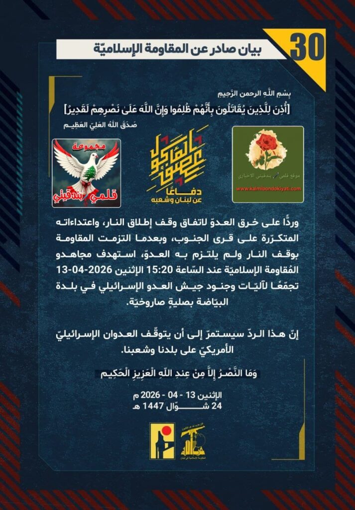 โ๐ ุตุฏุฑ ุจูุงู ุฑูู (30) ููู ูุงูู ุฉ ุงูุฅุณูุงู ูุฉ ุงูุขุชู ูุตู:”ุฏูุงุนูุง ุนู ูุจูุงู ูุดุนุจูุ ูุฑุฏููุง ุนูู ุฎุฑู ุงูุนุฏูู ูุงุชูุงู ููู ุฅุทูุงู ุงููุงุฑุ ูุงุนุชุฏุงุกุงุชู ุงูู ุชูุฑูุฑุฉ ุนูู ูุฑู ุงูุฌููุจุ ูุจุนุฏู ุง ุงูุชุฒู ุช ุงูู ูุงูู ุฉ ุจููู ุงููุงุฑ ููู ููุชุฒู ุจู ุงูุนุฏููุ ุงุณุชูุฏู ู ุฌุงูุฏู ุงูู ููุงูู ุฉ ุงูุฅุณูุงู ููุฉ ุนูุฏ ุงูุณูุงุนุฉ 15:20 ุงูุฅุซููู 13-04-2026 ุชุฌู ูุนูุง ูุขูููุงุช ูุฌููุฏ ุฌูุด ุงูุนุฏู ุงูุฅุณุฑุงุฆููู ูู ุจูุฏุฉ ุงูุจููุงุถุฉ ุจุตููุฉู ุตุงุฑูุฎููุฉ. ุฅูู ูุฐุง ุงูุฑุฏู ุณูุณุชู ุฑู ุฅูู ุฃู ูุชูููู ุงูุนุฏูุงู ุงูุฅุณุฑุงุฆูููู ุงูุฃู ุฑูููู ุนูู ุจูุฏูุง ูุดุนุจูุง.”