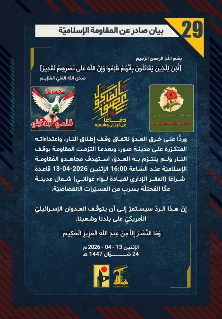 โ๐ ุตุฏุฑ ุจูุงู ุฑูู (29) ููู ูุงูู ุฉ ุงูุฅุณูุงู ูุฉ ุงูุขุชู ูุตู:”ุฏูุงุนูุง ุนู ูุจูุงู ูุดุนุจูุ ูุฑุฏููุง ุนูู ุฎุฑู ุงูุนุฏูู ูุงุชูุงู ููู ุฅุทูุงู ุงููุงุฑุ ูุงุนุชุฏุงุกุงุชู ุงูู ุชูุฑูุฑุฉ ุนูู ู ุฏููุฉ ุตูุฑุ ูุจุนุฏู ุง ุงูุชุฒู ุช ุงูู ูุงูู ุฉ ุจููู ุงููุงุฑ ููู ููุชุฒู ุจู ุงูุนุฏููุ ุงุณุชูุฏู ู ุฌุงูุฏู ุงูู ููุงูู ุฉ ุงูุฅุณูุงู ููุฉ ุนูุฏ ุงูุณูุงุนุฉ 16:00 ุงูุฅุซููู 13-04-2026 ูุงุนุฏุฉ ุดุฑุงุบุง (ุงูู ูุฑ ุงูุฅุฏุงุฑู ูููุงุฏุฉ ููุงุก ุบููุงูู) ุดู ุงู ู ุฏููุฉ ุนููุง ุงูู ูุญุชููุฉ ุจุณุฑุจู ู ู ุงูู ุณููุฑุงุช ุงูุงููุถุงุถููุฉ. ุฅูู ูุฐุง ุงูุฑุฏู ุณูุณุชู ุฑู ุฅูู ุฃู ูุชูููู ุงูุนุฏูุงู ุงูุฅุณุฑุงุฆูููู ุงูุฃู ุฑูููู ุนูู ุจูุฏูุง ูุดุนุจูุง.”