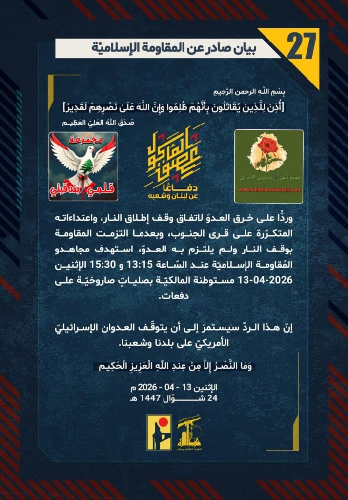 โ๐ ุตุฏุฑ ุจูุงู ุฑูู (27) ููู ูุงูู ุฉ ุงูุฅุณูุงู ูุฉ ุงูุขุชู ูุตู:”ุฏูุงุนูุง ุนู ูุจูุงู ูุดุนุจูุ ูุฑุฏููุง ุนูู ุฎุฑู ุงูุนุฏูู ูุงุชูุงู ููู ุฅุทูุงู ุงููุงุฑุ ูุงุนุชุฏุงุกุงุชู ุงูู ุชูุฑูุฑุฉ ุนูู ูุฑู ุงูุฌููุจุ ูุจุนุฏู ุง ุงูุชุฒู ุช ุงูู ูุงูู ุฉ ุจููู ุงููุงุฑ ููู ููุชุฒู ุจู ุงูุนุฏููุ ุงุณุชูุฏู ู ุฌุงูุฏู ุงูู ููุงูู ุฉ ุงูุฅุณูุงู ููุฉ ุนูุฏ ุงูุณูุงุนุฉ 13:15 ู 15:30 ุงูุฅุซููู 13-04-2026 ู ุณุชูุทูุฉ ุงูู ุงููููุฉ ุจุตููุงุชู ุตุงุฑูุฎููุฉ ุนูู ุฏูุนุงุช. ุฅูู ูุฐุง ุงูุฑุฏู ุณูุณุชู ุฑู ุฅูู ุฃู ูุชูููู ุงูุนุฏูุงู ุงูุฅุณุฑุงุฆูููู ุงูุฃู ุฑูููู ุนูู ุจูุฏูุง ูุดุนุจูุง.”