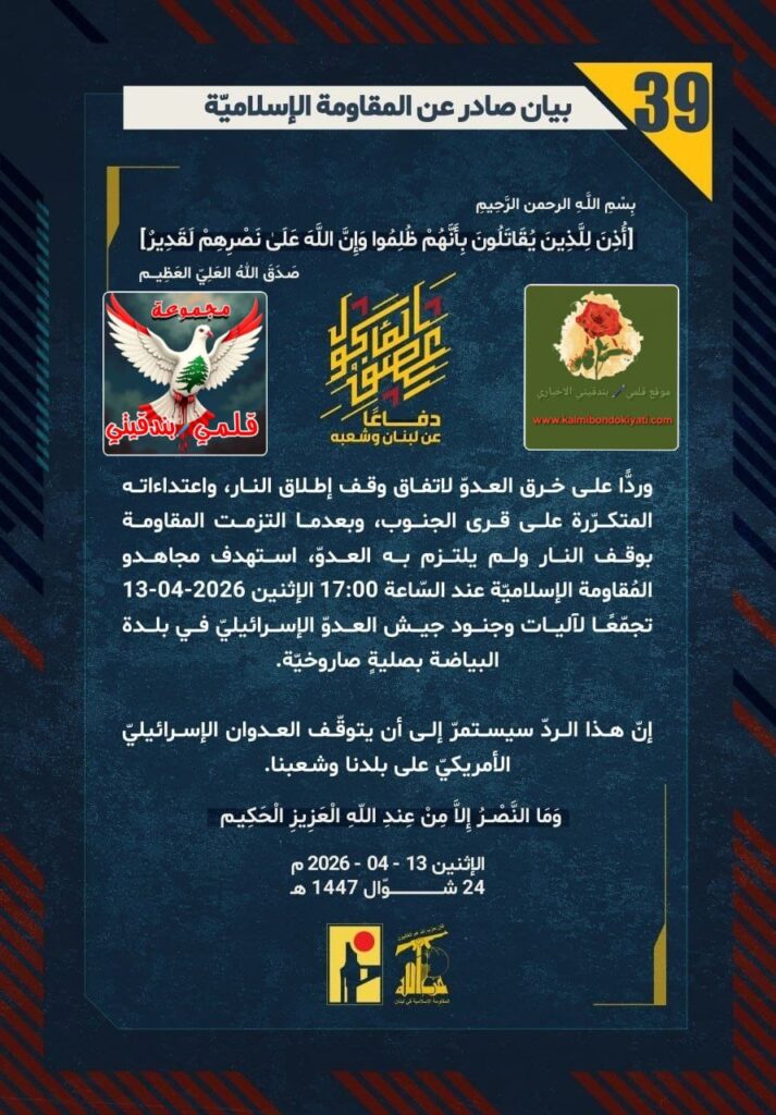 โ๐ ุตุฏุฑ ุจูุงู ุฑูู (39) ููู ูุงูู ุฉ ุงูุฅุณูุงู ูุฉ ุงูุขุชู ูุตู:”ุฏูุงุนูุง ุนู ูุจูุงู ูุดุนุจูุ ูุฑุฏููุง ุนูู ุฎุฑู ุงูุนุฏูู ูุงุชูุงู ููู ุฅุทูุงู ุงููุงุฑุ ูุงุนุชุฏุงุกุงุชู ุงูู ุชูุฑูุฑุฉ ุนูู ูุฑู ุงูุฌููุจุ ูุจุนุฏู ุง ุงูุชุฒู ุช ุงูู ูุงูู ุฉ ุจููู ุงููุงุฑ ููู ููุชุฒู ุจู ุงูุนุฏููุ ุงุณุชูุฏู ู ุฌุงูุฏู ุงูู ููุงูู ุฉ ุงูุฅุณูุงู ููุฉ ุนูุฏ ุงูุณูุงุนุฉ 17:00 ุงูุฅุซููู 13-04-2026 ุชุฌู ูุนูุง ูุขููุงุช ูุฌููุฏ ุฌูุด ุงูุนุฏูู ุงูุฅุณุฑุงุฆูููู ูู ุจูุฏุฉ ุงูุจูุงุถุฉ ุจุตููุฉู ุตุงุฑูุฎููุฉ. ุฅูู ูุฐุง ุงูุฑุฏู ุณูุณุชู ุฑู ุฅูู ุฃู ูุชูููู ุงูุนุฏูุงู ุงูุฅุณุฑุงุฆูููู ุงูุฃู ุฑูููู ุนูู ุจูุฏูุง ูุดุนุจูุง.”