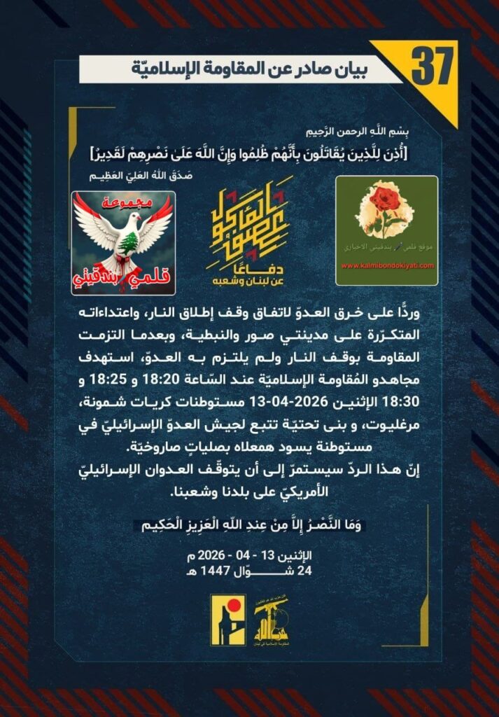โ๐ ุตุฏุฑ ุจูุงู ุฑูู (37) ููู ูุงูู ุฉ ุงูุฅุณูุงู ูุฉ ุงูุขุชู ูุตู:”ุฏูุงุนูุง ุนู ูุจูุงู ูุดุนุจูุ ูุฑุฏููุง ุนูู ุฎุฑู ุงูุนุฏูู ูุงุชูุงู ููู ุฅุทูุงู ุงููุงุฑุ ูุงุนุชุฏุงุกุงุชู ุงูู ุชูุฑูุฑุฉ ุนูู ู ุฏููุชู ุตูุฑ ูุงููุจุทูุฉุ ูุจุนุฏู ุง ุงูุชุฒู ุช ุงูู ูุงูู ุฉ ุจููู ุงููุงุฑ ููู ููุชุฒู ุจู ุงูุนุฏููุ ุงุณุชูุฏู ู ุฌุงูุฏู ุงูู ููุงูู ุฉ ุงูุฅุณูุงู ููุฉ ุนูุฏ ุงูุณูุงุนุฉ 18:20 ู 18:25 ู 18:30 ุงูุฅุซููู 13-04-2026 ู ุณุชูุทูุงุช ูุฑูุงุช ุดู ููุฉุ ู ุฑุบูููุชุ ู ุจูู ุชุญุชููุฉ ุชุชุจุน ูุฌูุด ุงูุนุฏูู ุงูุฅุณุฑุงุฆูููู ูู ู ุณุชูุทูุฉ ูุณูุฏ ูู ุนูุงู ุจุตููุงุชู ุตุงุฑูุฎููุฉ. ุฅูู ูุฐุง ุงูุฑุฏู ุณูุณุชู ุฑู ุฅูู ุฃู ูุชูููู ุงูุนุฏูุงู ุงูุฅุณุฑุงุฆูููู ุงูุฃู ุฑูููู ุนูู ุจูุฏูุง ูุดุนุจูุง.”